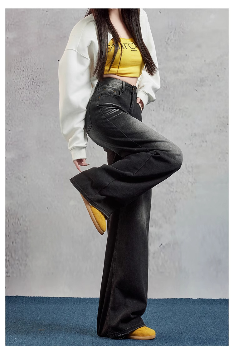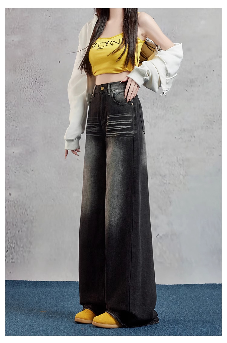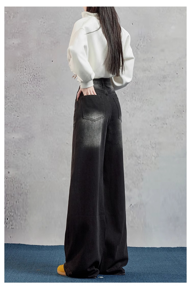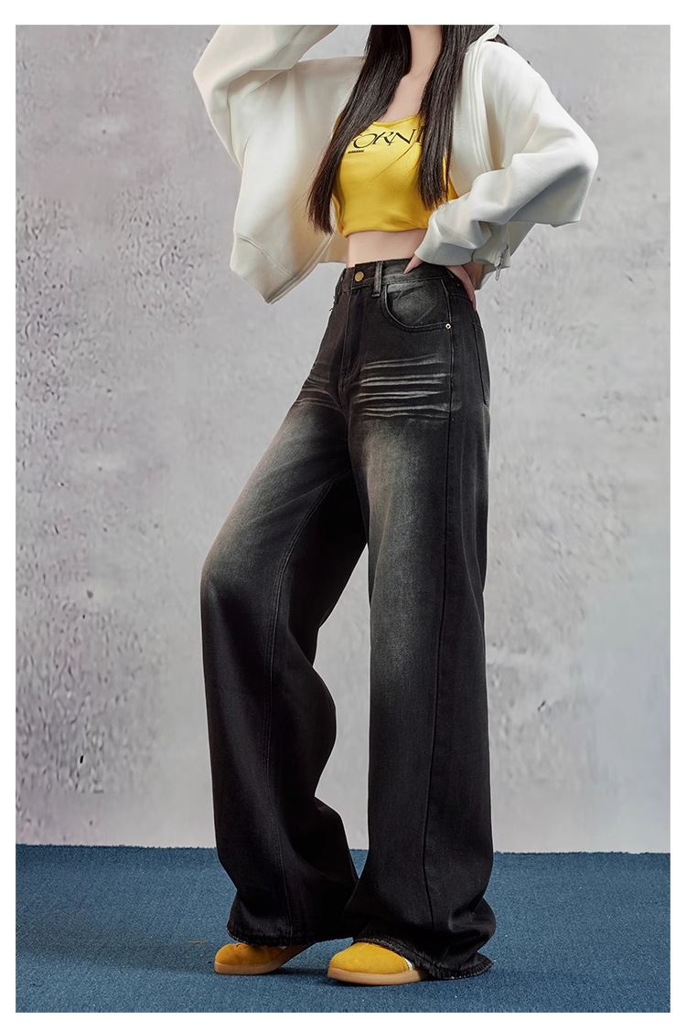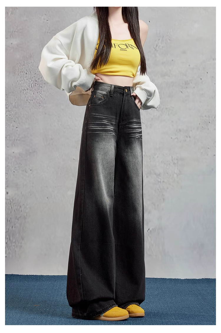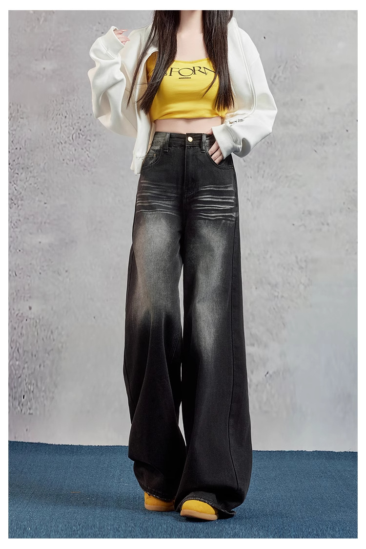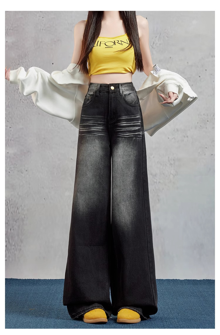 여성을위한 블랙 그레이 와이드 레그 청바지 2025 여름 새로운 스타일 뚱뚱한 MM 하이 웨이스트 슬리밍 루즈 아메리칸 스트레이트 바지스토어 가기