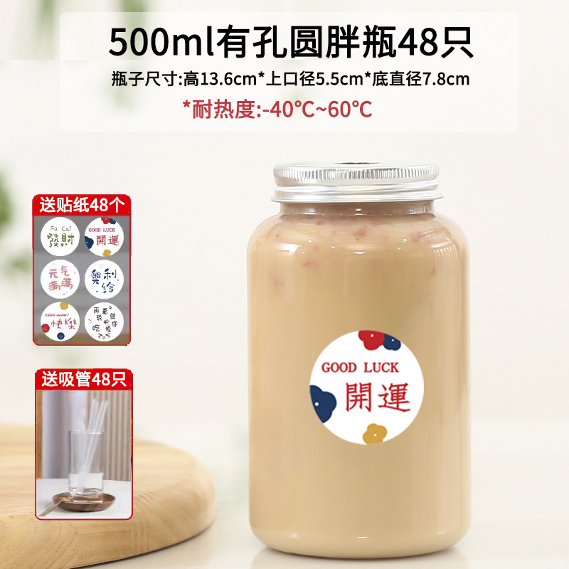 • 구멍이 있는 뚜껑이 있는 둥근 지방병 500ml 48세트 무료 스티커 + 빨대
