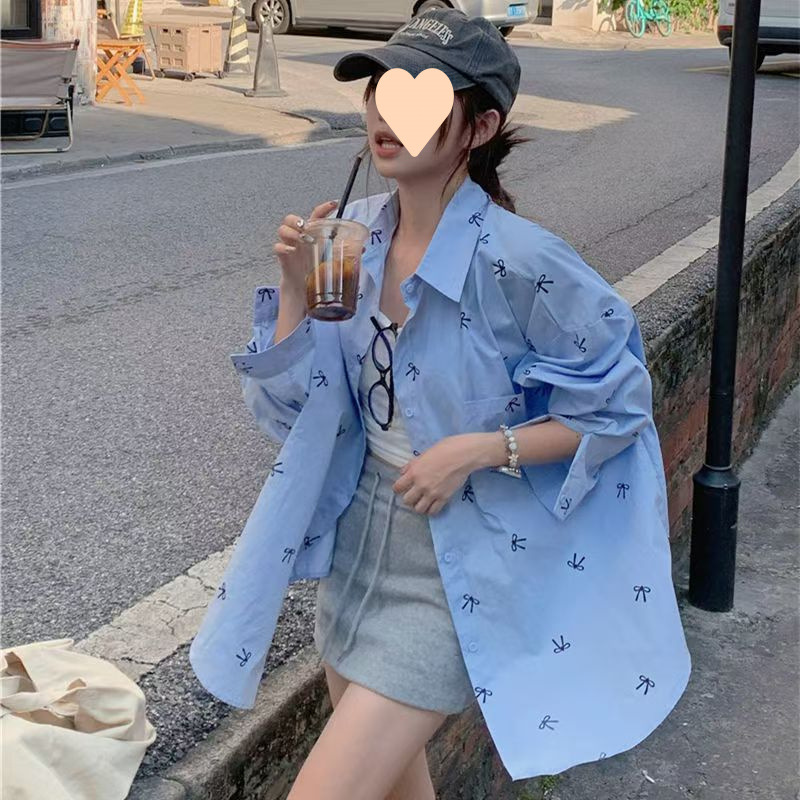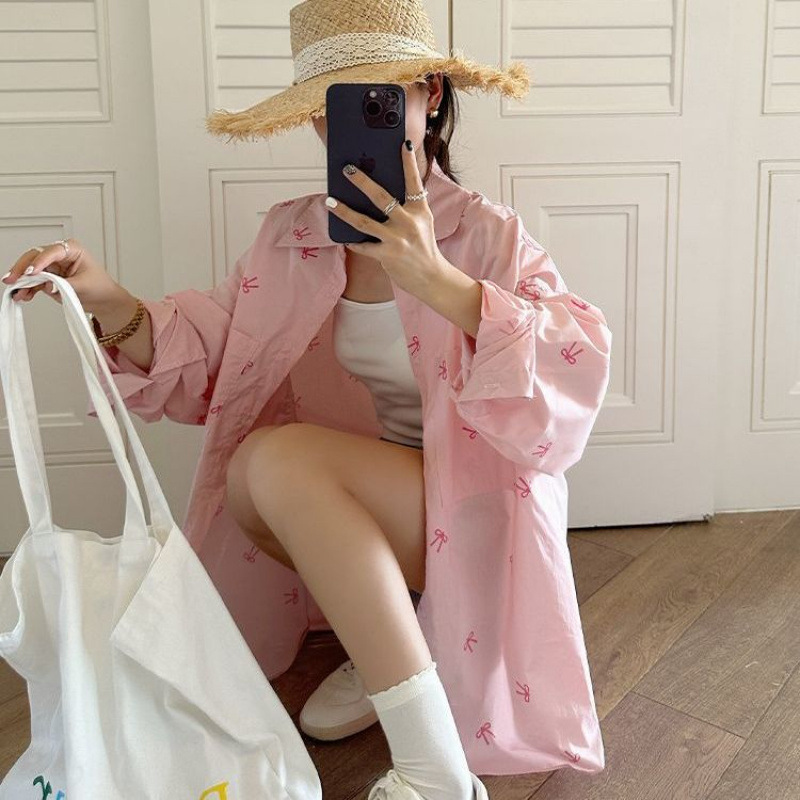 2025 핑크 보우 프린트 긴팔 셔츠 봄 새로운 달콤한 게으른 느슨한 자외선 차단 코트 탑 여성용스토어 가기