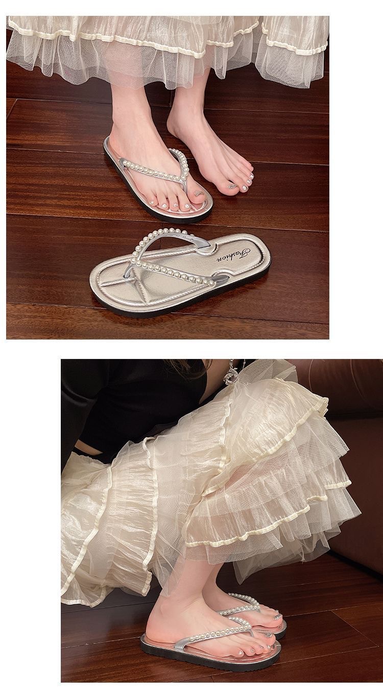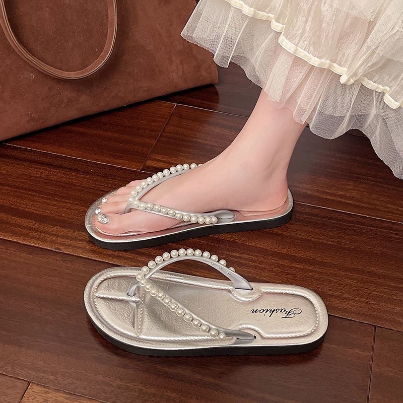 여성을위한 한국 스타일 패션 플랫 플립 플롭 2025 봄과 여름 새로운 스타일 요정 스타일 라인 석 여성 비치 플립 플롭