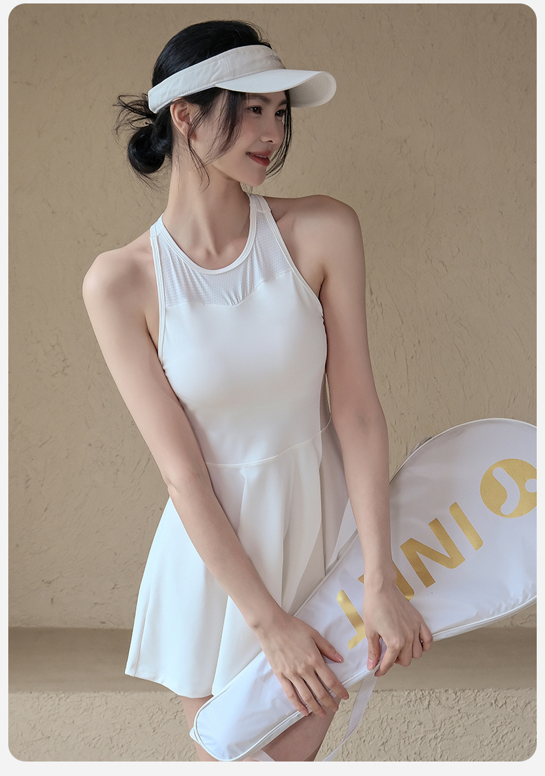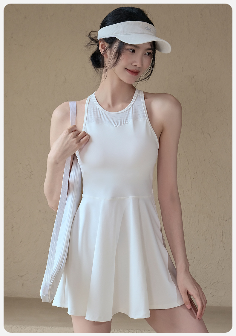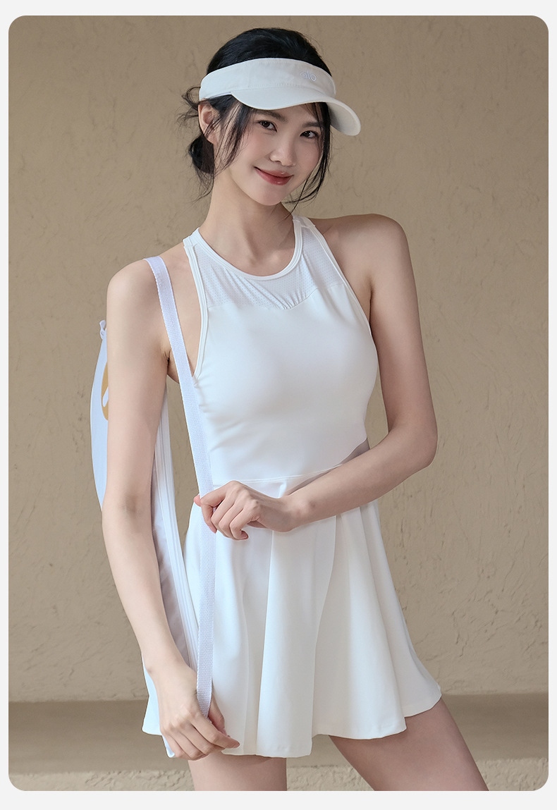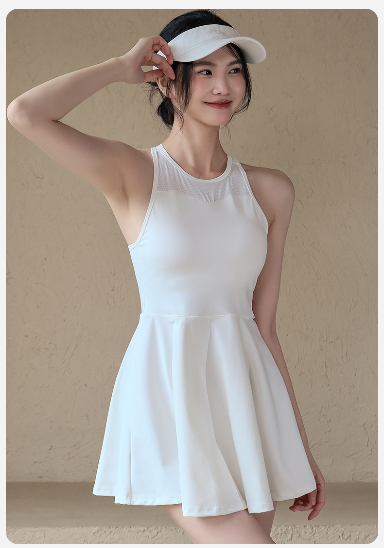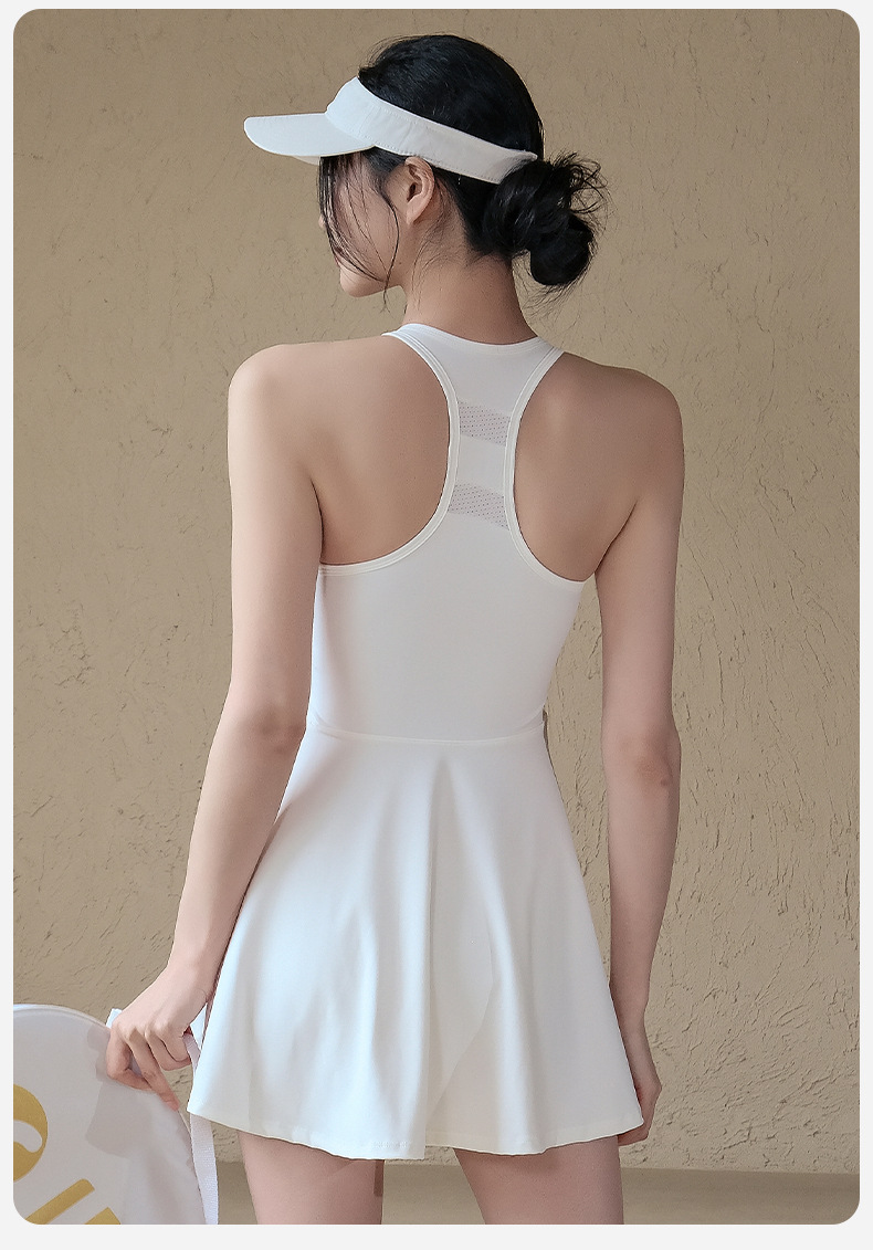 가슴 패드가 있는 여성용 하이엔드 여름 짧은 스커트 점프수트, 런닝 트레이닝 드레스, 누드 통기성 요가 피트니스웨어스토어 가기