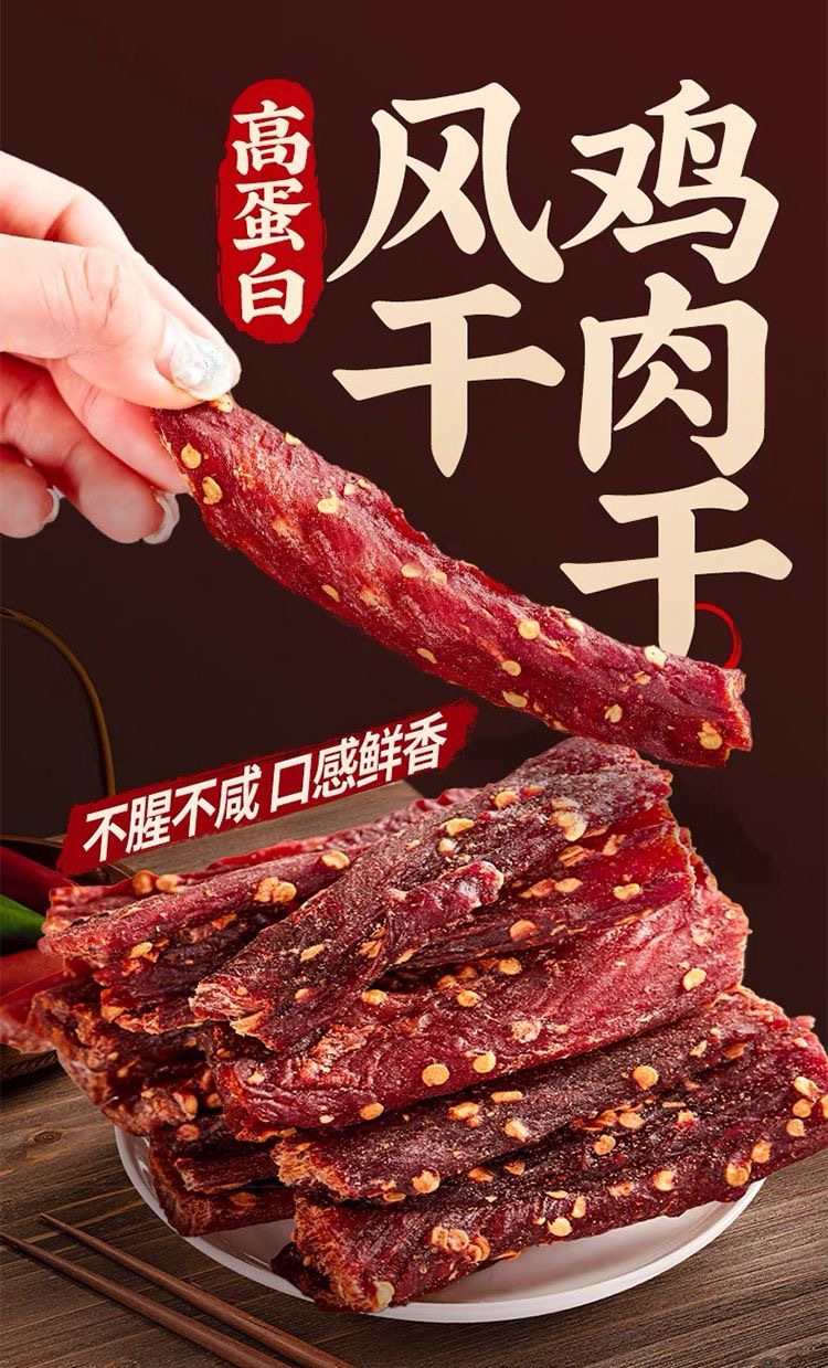 치킨 육포, 자연 건조된 닭가슴살 스트립, 고단백, 배고픔 방지, 쫄깃함 감소, 지방 감소, 피트니스 스낵, 스낵 식품
