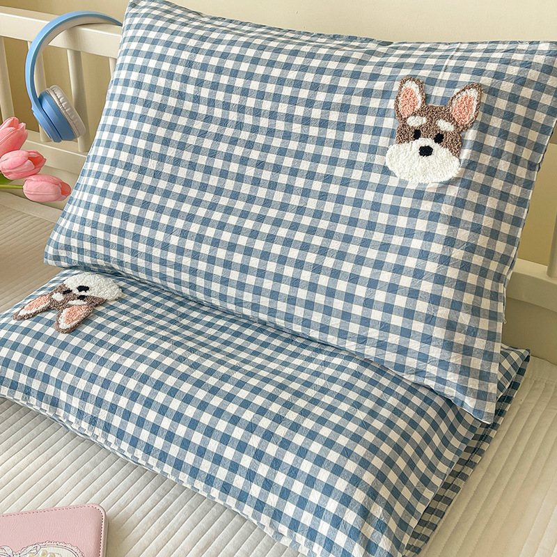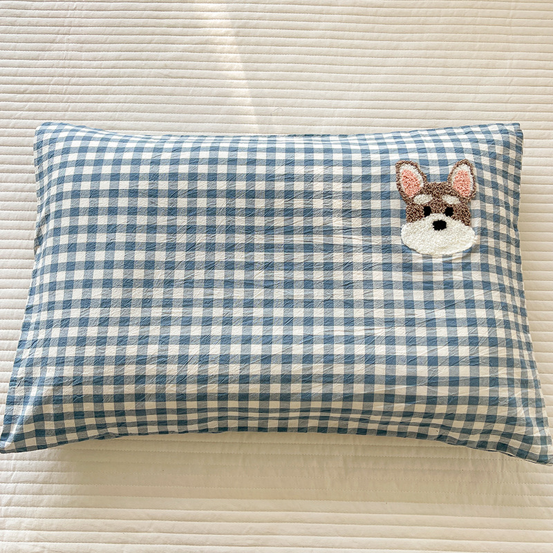 • Qiqi 블루 작은 격자 [A급 면 100% 워싱 면 수건 자수 베갯잇] 싱글 팩