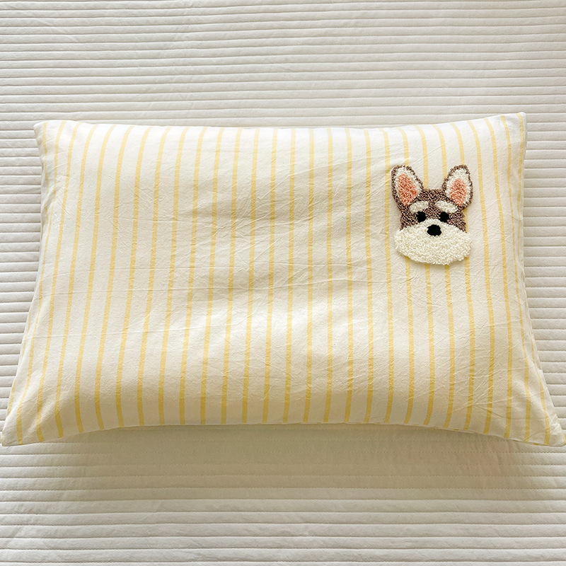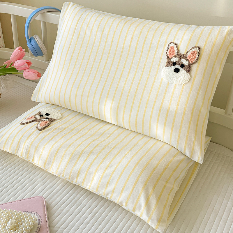 • Qiqi 컬러 스트라이프 옐로우 [A급 면 100% 워시드 코튼 타월 자수 베갯잇] 싱글 팩