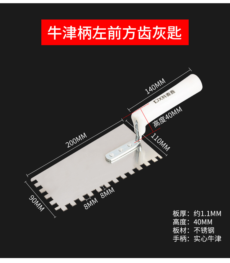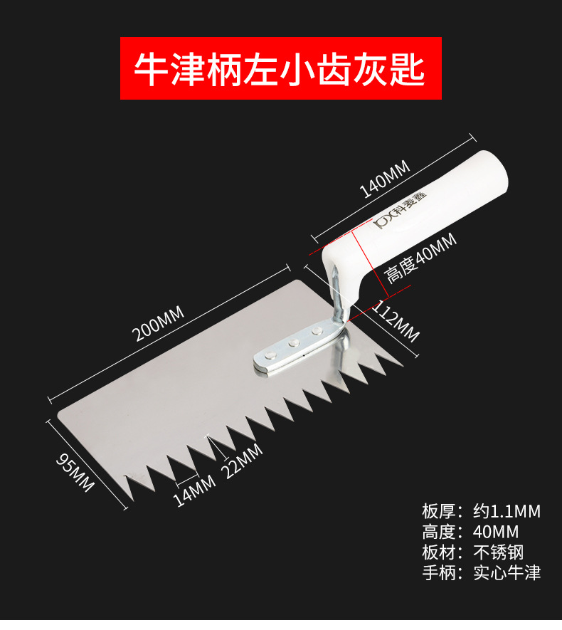 톱니가 있는 미장칼, 옥스퍼드 손잡이, 타일 칼, 스테인레스 스틸 타일 미장칼, 벽 타일 미장칼