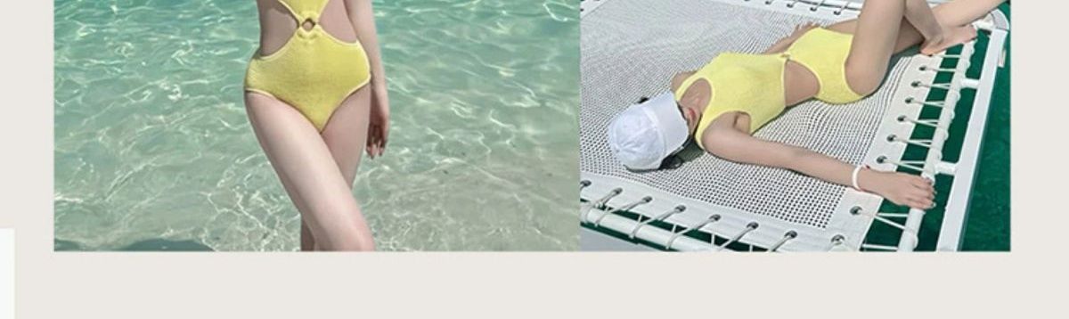 아일랜드 홀리데이 옐로우 퓨어 디자이어 트라이앵글 원피스 수영복 여성스러운 웨이브 패턴 중공 허리 휴가 수영복스토어 가기