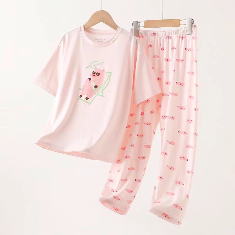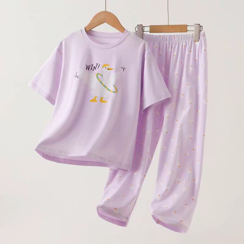여자 잠옷 클래스 a 여름 얇은 만화 가정 의류 반팔 양복 2025 새로운 순수 면화 어린이 에어컨 옷