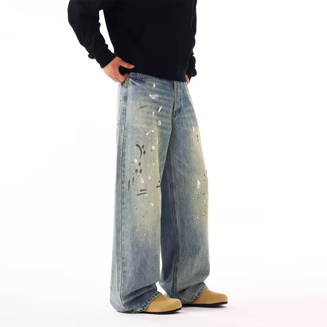 크로스보더 남성 청바지 2025 가을 신상 하이 스트리트 스플래시 잉크 스트레이트 청바지 남성 캐주얼 바지 재고 있음스토어 가기