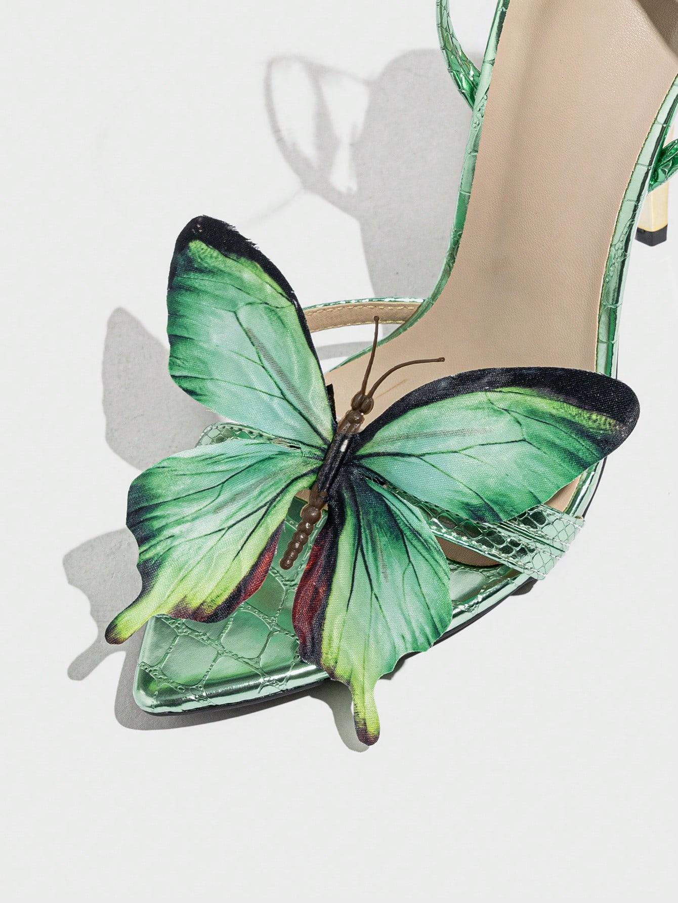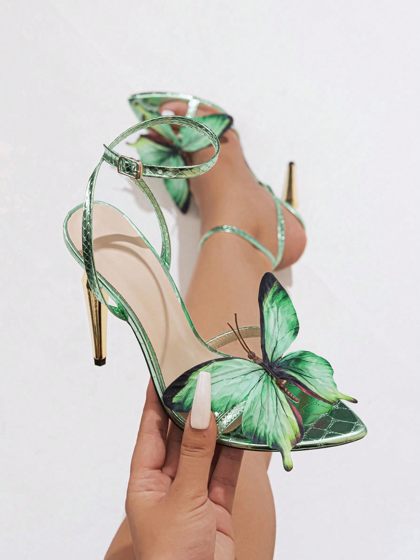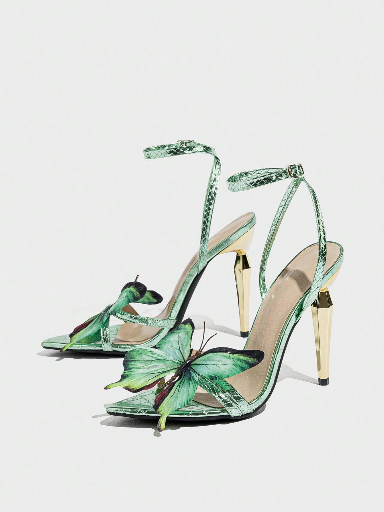 공장 도매 국경 간 유럽과 미국 여성의 입체 나비 장식 전기 도금 스틸레토 샌들 녹색 하이힐스토어 가기