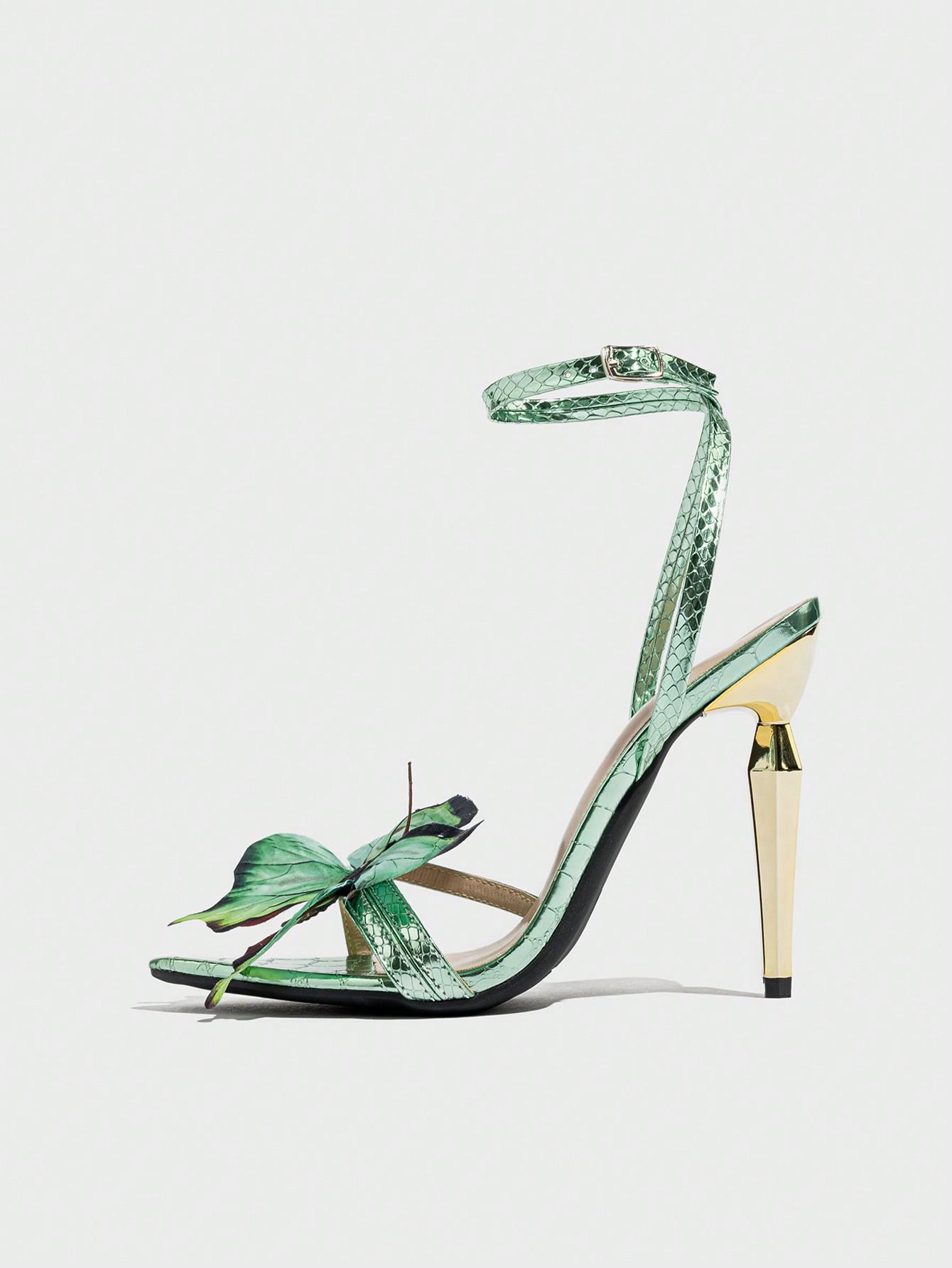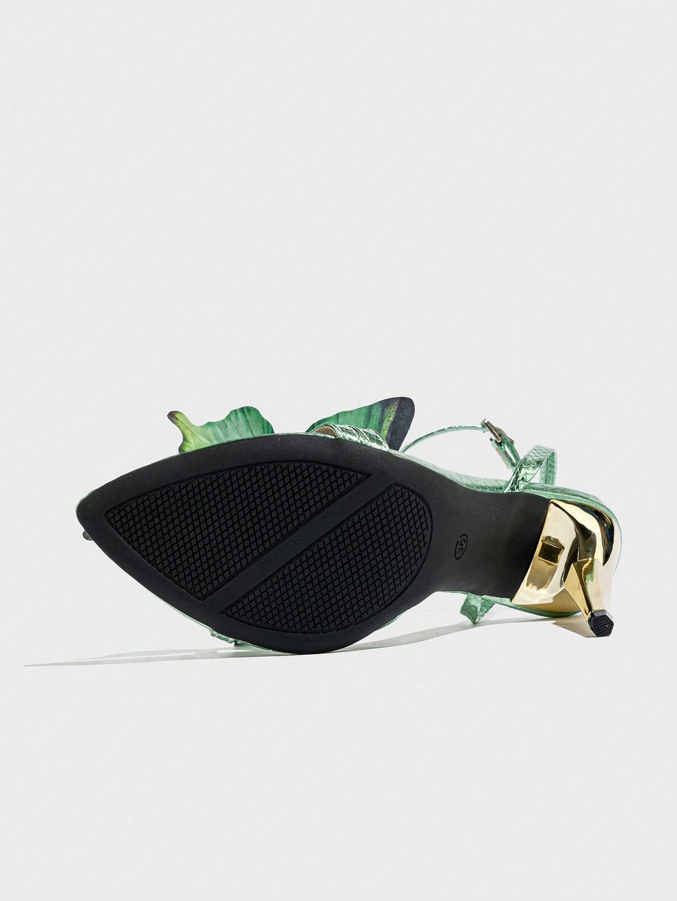 공장 도매 국경 간 유럽과 미국 여성의 입체 나비 장식 전기 도금 스틸레토 샌들 녹색 하이힐