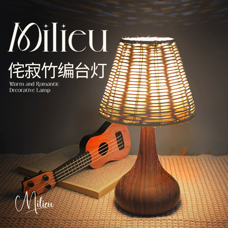 복고풍 문학 스타일 야간 조명 침실 수면 중세 와비사비 낭만적 인 장식 창조적 인 침대 옆 목가적 인 대나무 테이블 램프