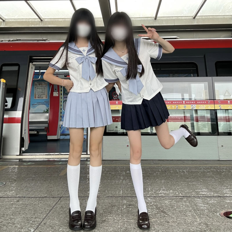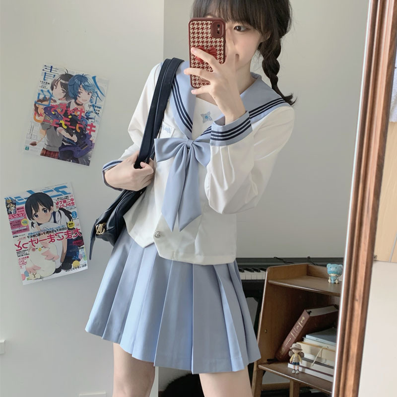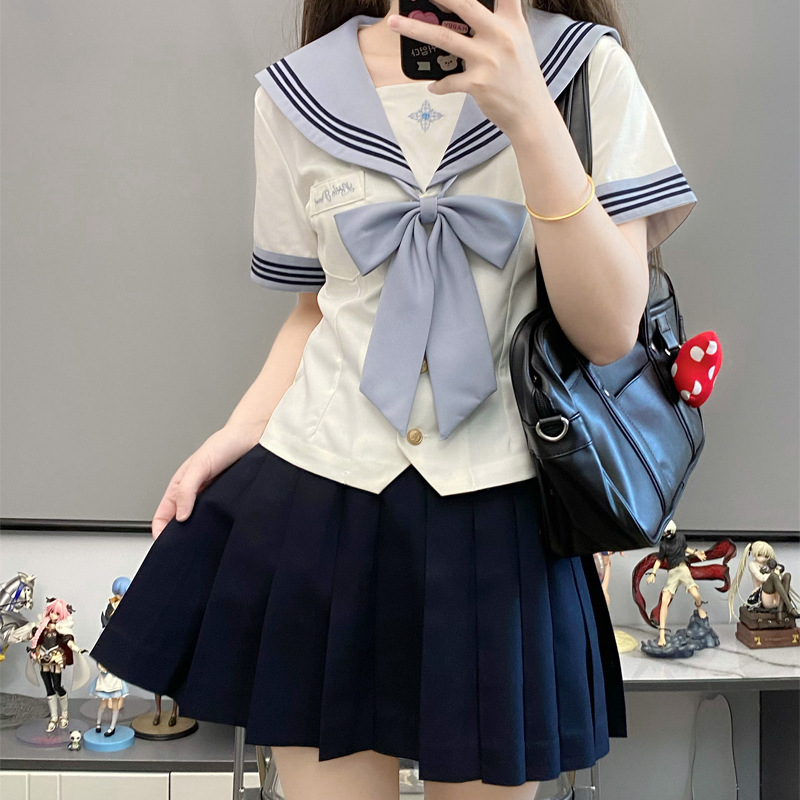 • Linglan 개인 밀크 화이트 반팔 + 아쿠아 블루 42CM 스커트 정장 프리 나비 넥타이
