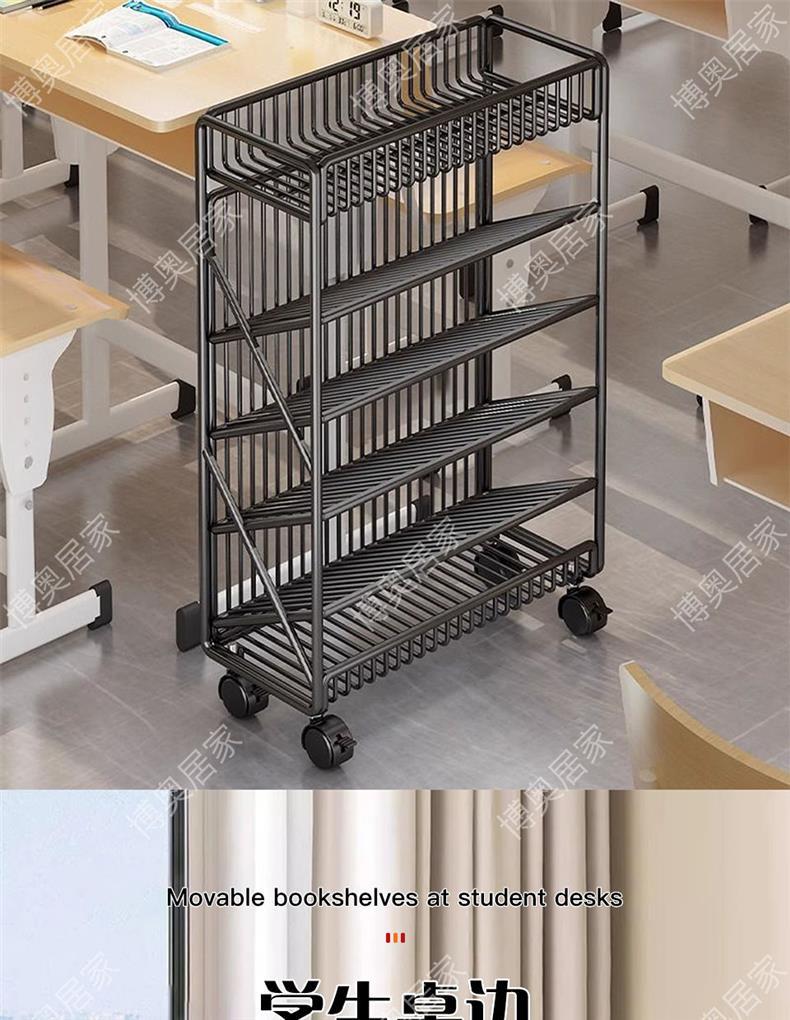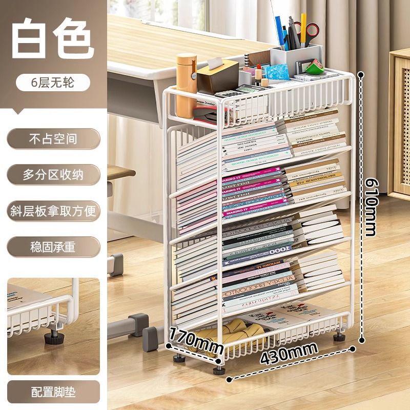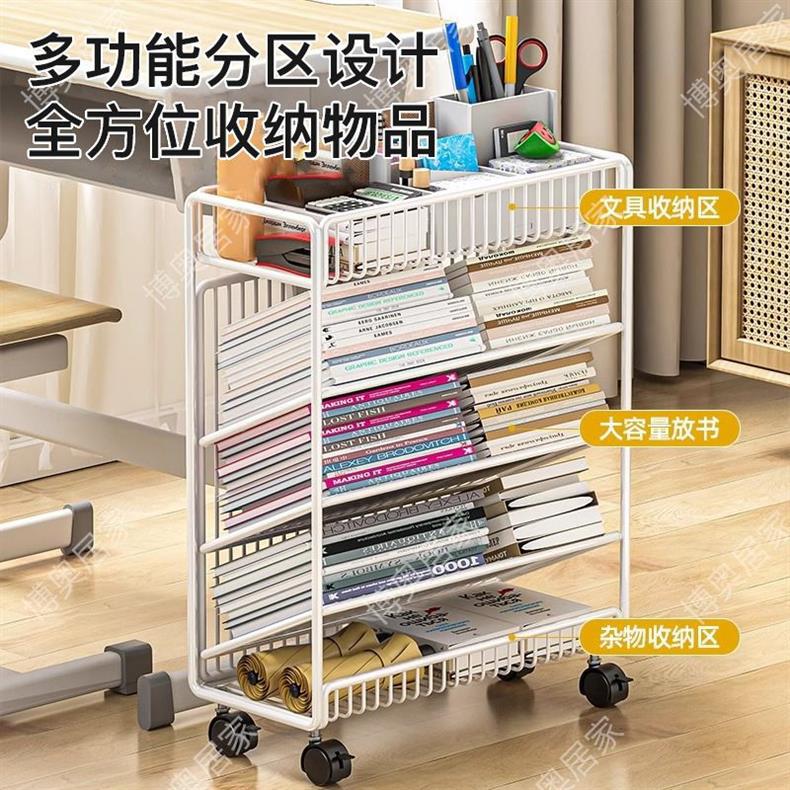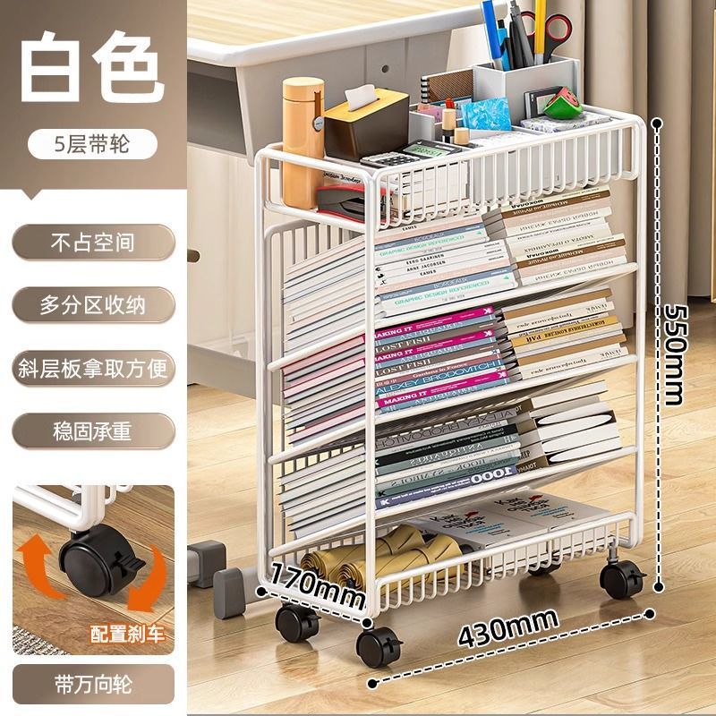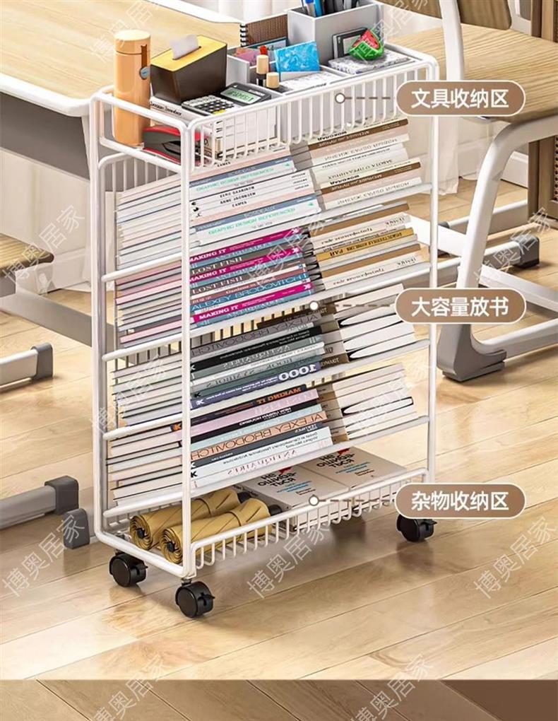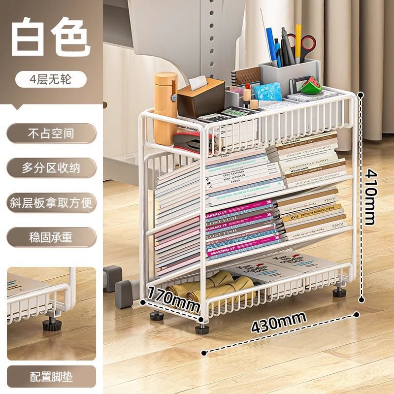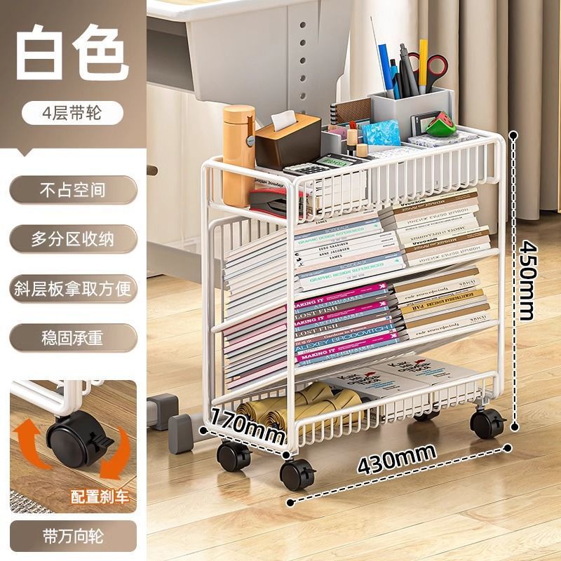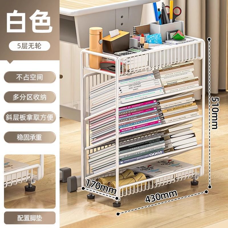 책을 보관할 수 있는 이동식 책상 옆 책장 책상 옆 바닥에 학생 학습 책상 바퀴가 달린 경사진 수납 선반이 있는 수납 선반