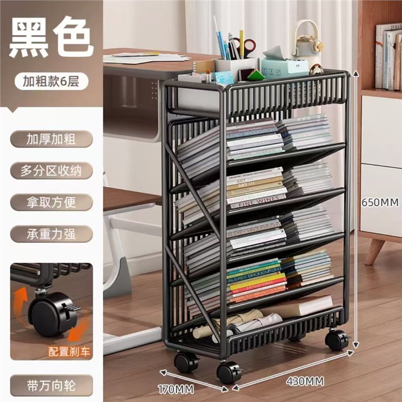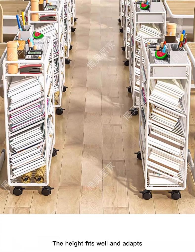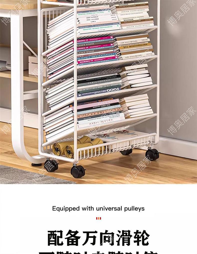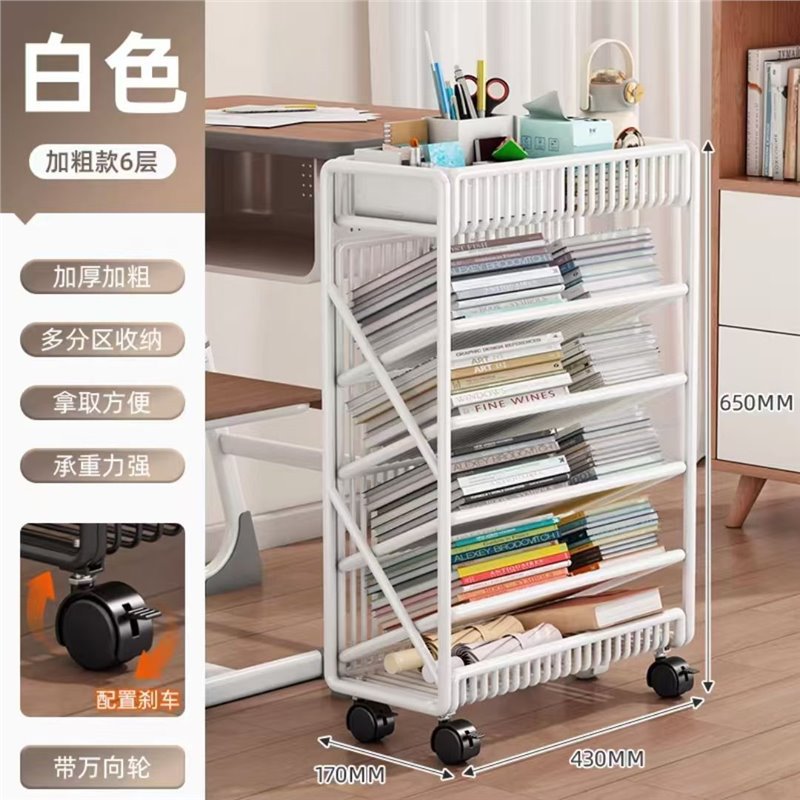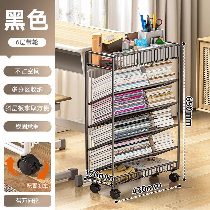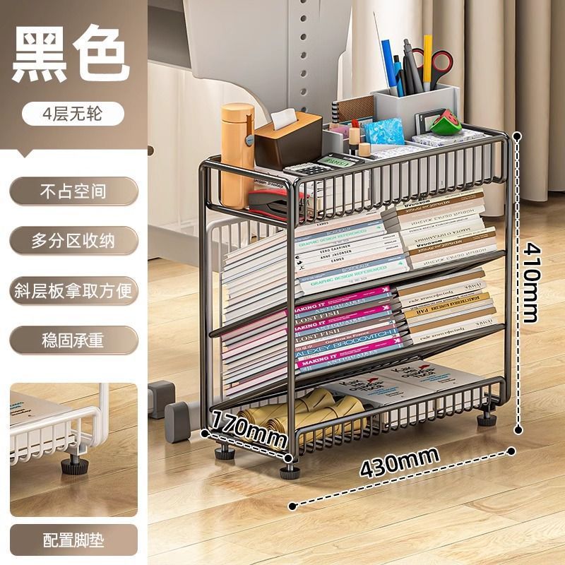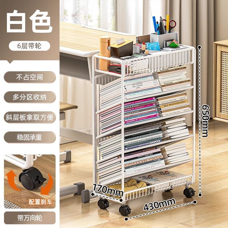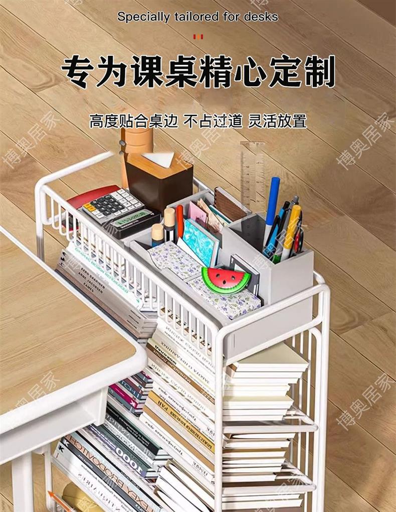 책을 보관할 수 있는 이동식 책상 옆 책장 책상 옆 바닥에 학생 학습 책상 바퀴가 달린 경사진 수납 선반이 있는 수납 선반