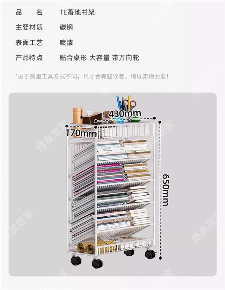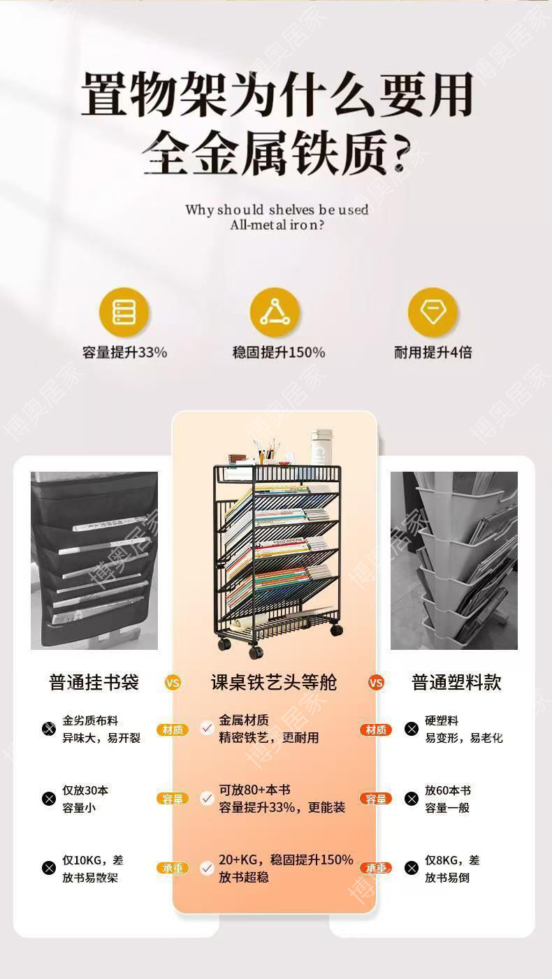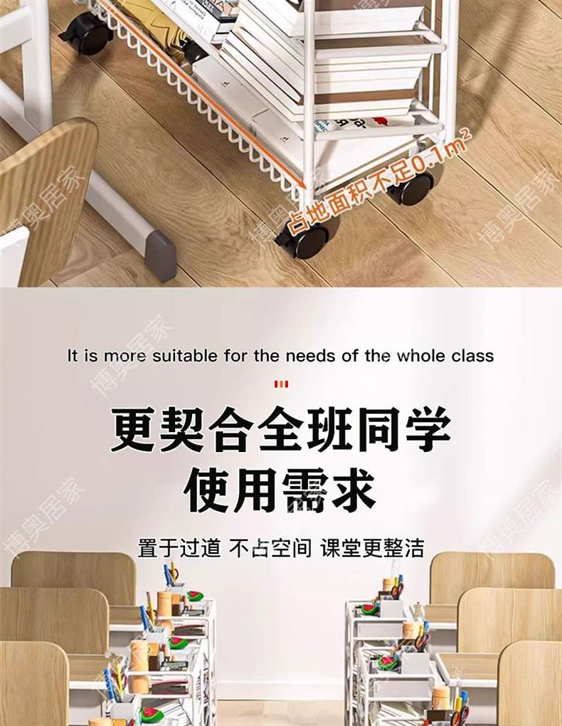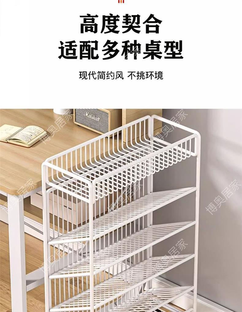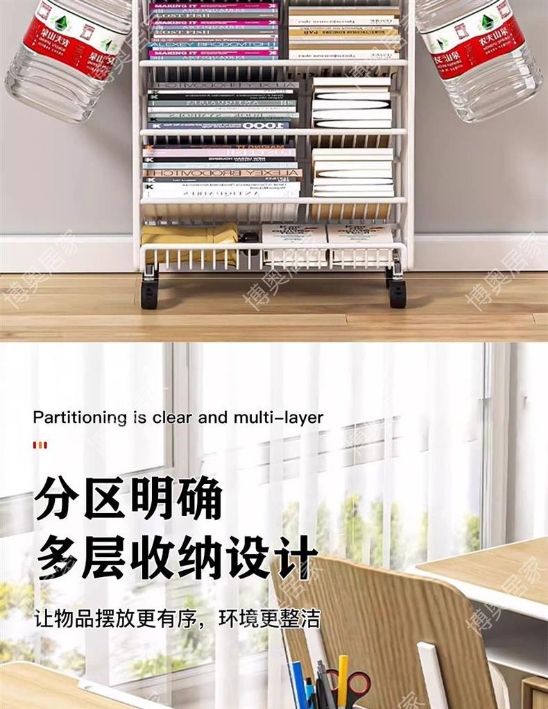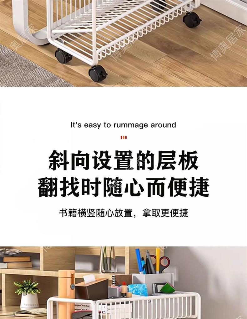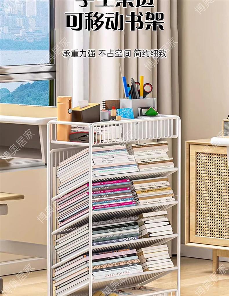 책을 보관할 수 있는 이동식 책상 옆 책장 책상 옆 바닥에 학생 학습 책상 바퀴가 달린 경사진 수납 선반이 있는 수납 선반