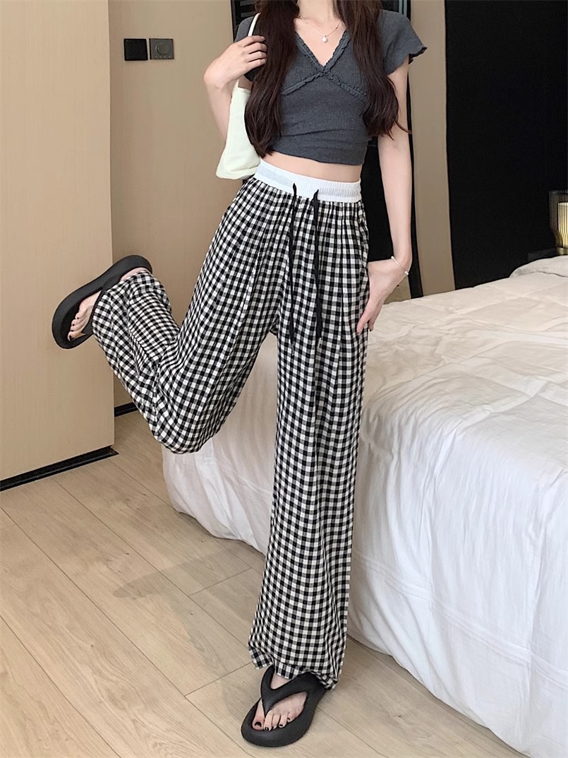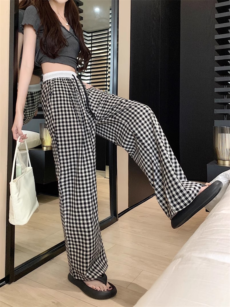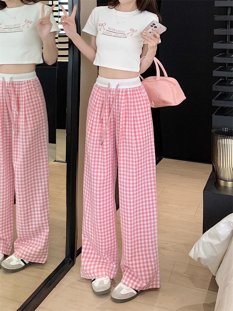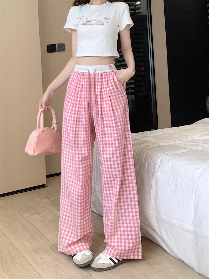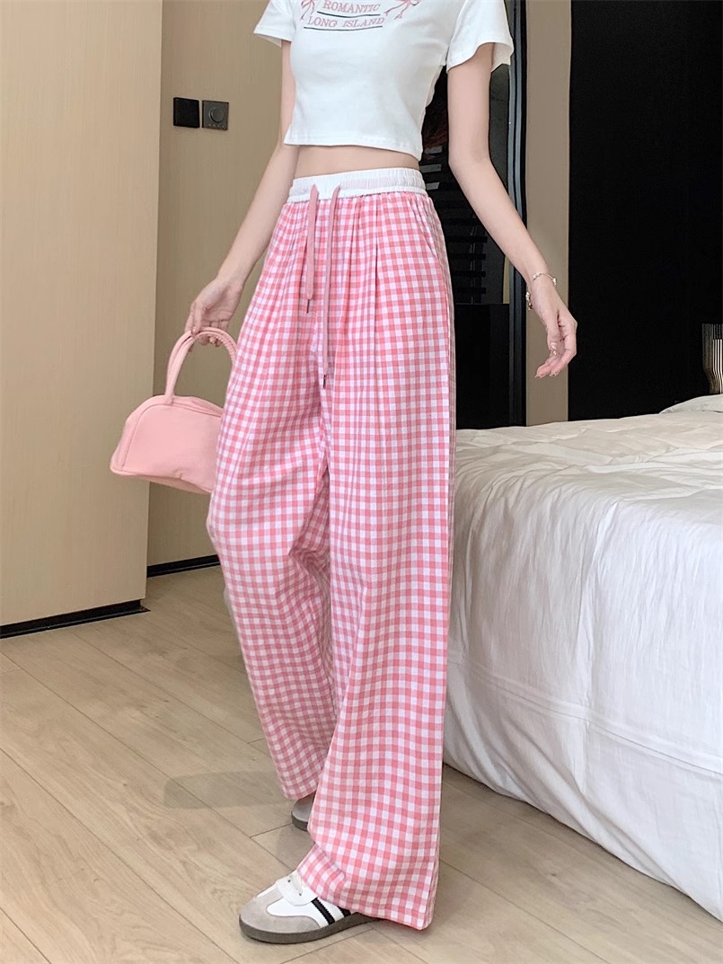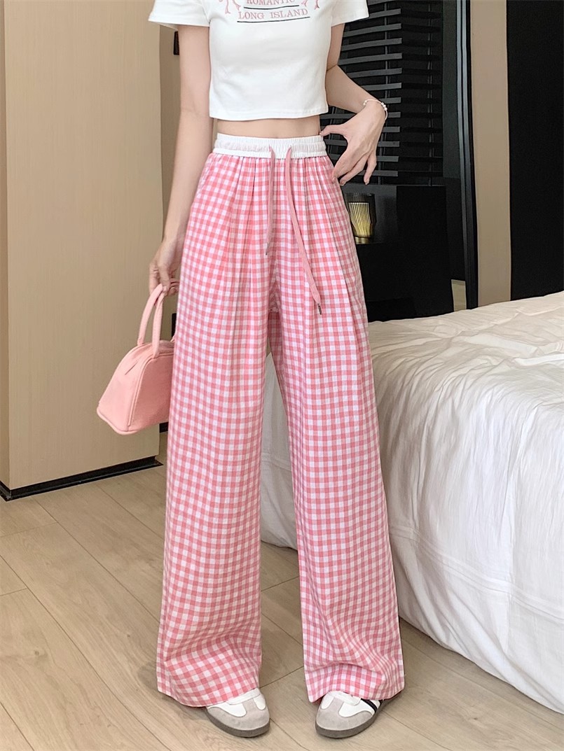 여름 얇은 핑크 격자 무늬 와이드 레그 팬츠 여성용 새로운 하이 웨이스트 드레이프 루즈 레이지 캐주얼 바닥 길이 바지
