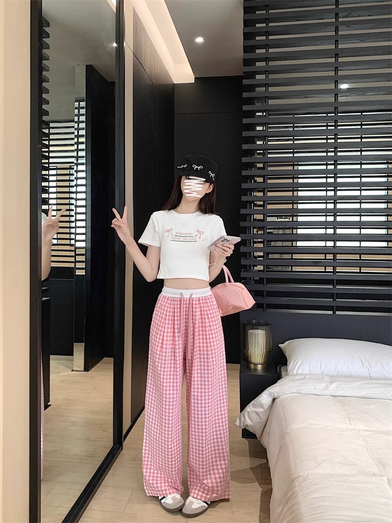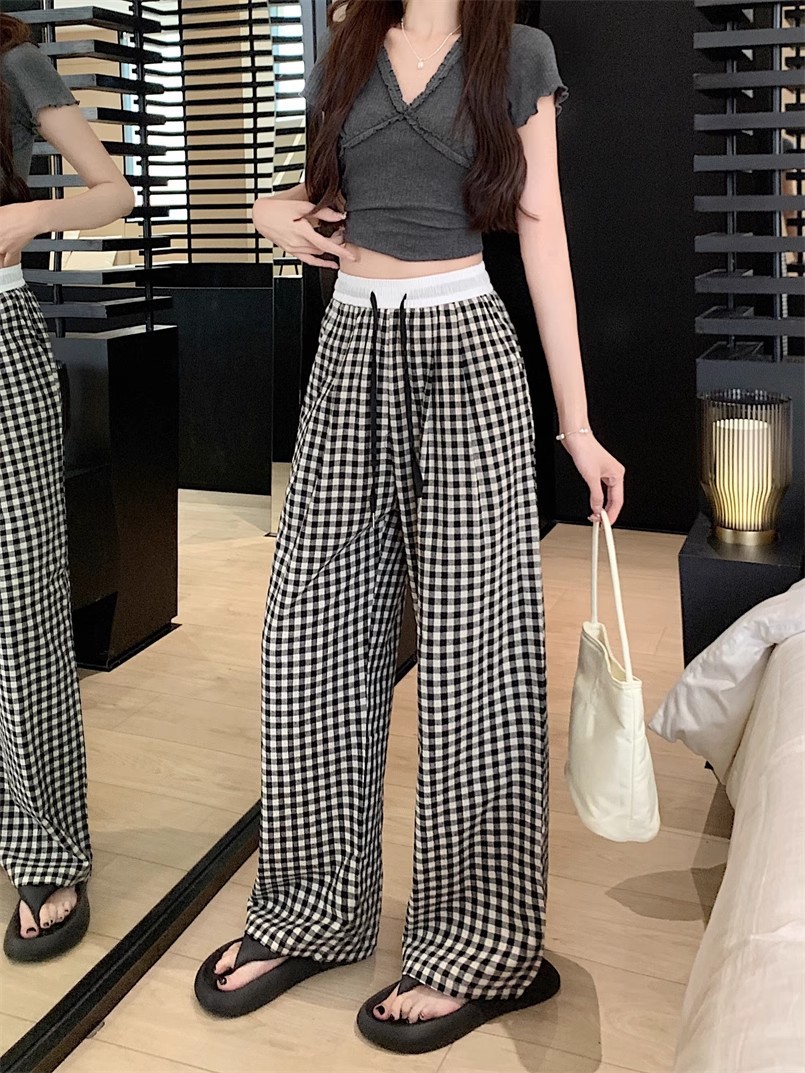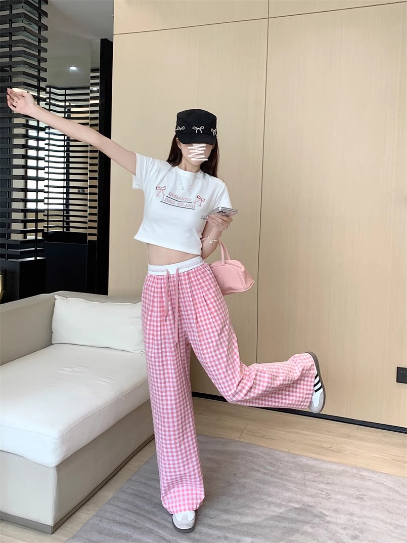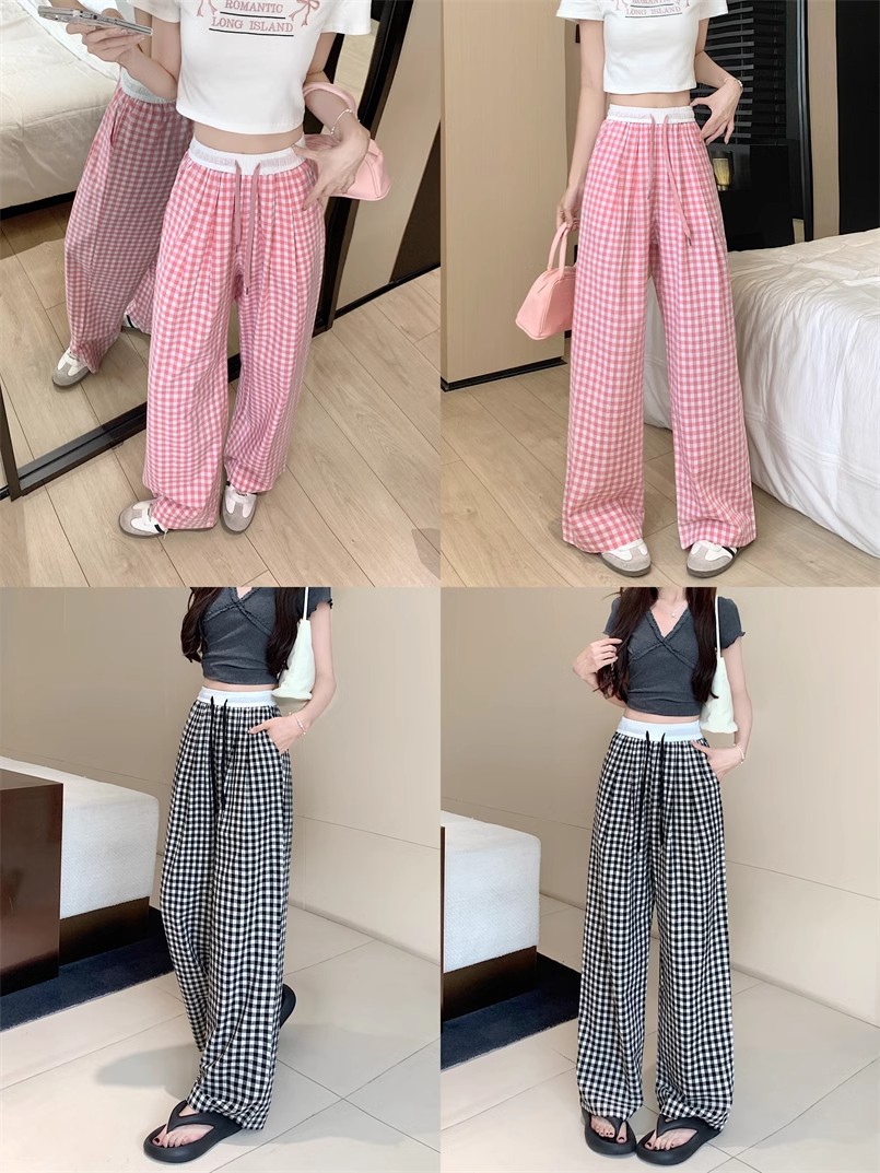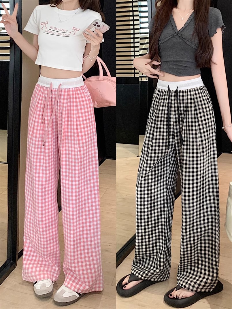 여름 얇은 핑크 격자 무늬 와이드 레그 팬츠 여성용 새로운 하이 웨이스트 드레이프 루즈 레이지 캐주얼 바닥 길이 바지스토어 가기