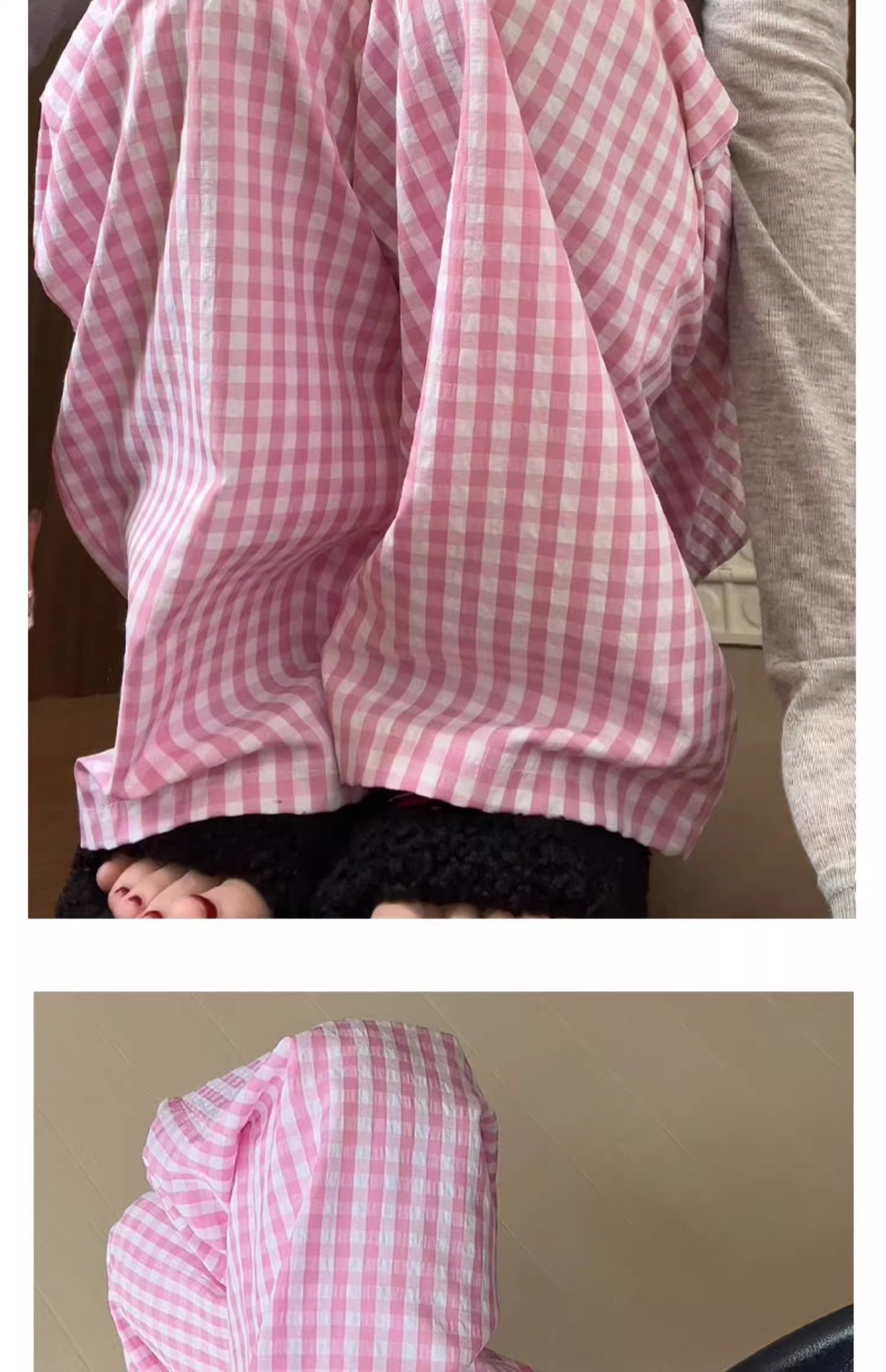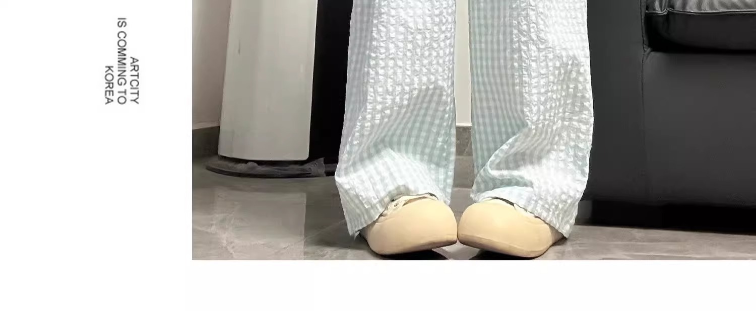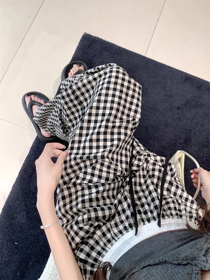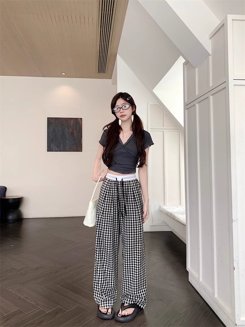 여름 얇은 핑크 격자 무늬 와이드 레그 팬츠 여성용 새로운 하이 웨이스트 드레이프 루즈 레이지 캐주얼 바닥 길이 바지스토어 가기