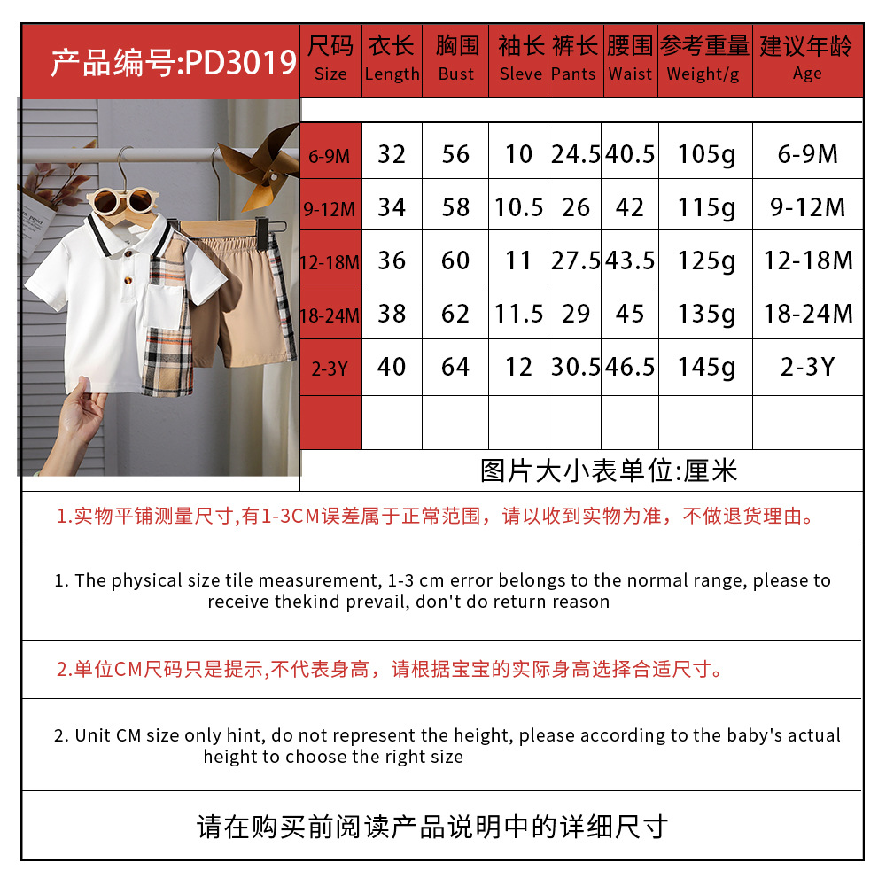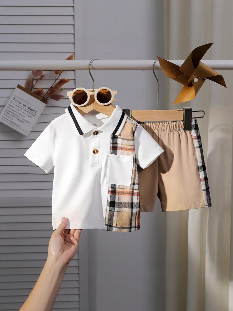 아동상의, 여름옷, 아동복, 신생아 라펠, 패셔너블한 체크무늬 옷, 얇은 반팔반바지 투피스 세트스토어 가기