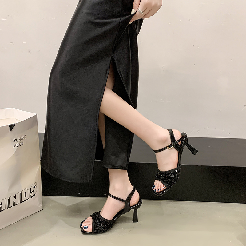 2025년 새로운 여름 스타일 스팽글 기질, 성숙한 스틸레토 힐, 다재다능하고 패셔너블한 여성용 원라인 엔젤 스타일 하이힐 샌들스토어 가기