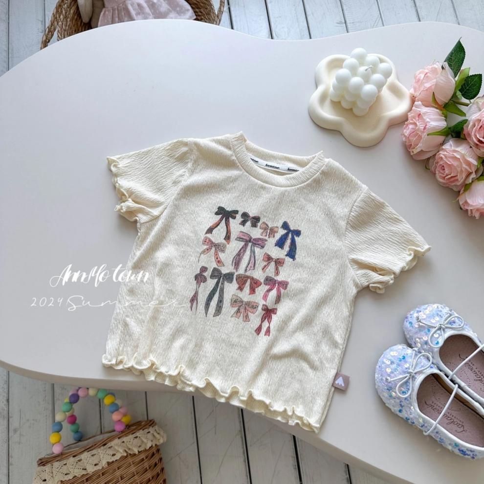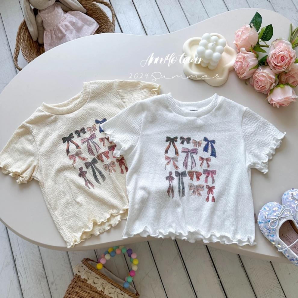 아동복 2025 여름 새 스타일 소녀 프린트 보우 레이스 티셔츠 아기 귀여운 달콤한 반팔 탑