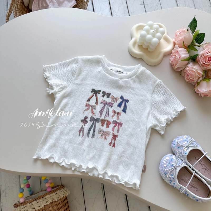 아동복 2025 여름 새 스타일 소녀 프린트 보우 레이스 티셔츠 아기 귀여운 달콤한 반팔 탑스토어 가기