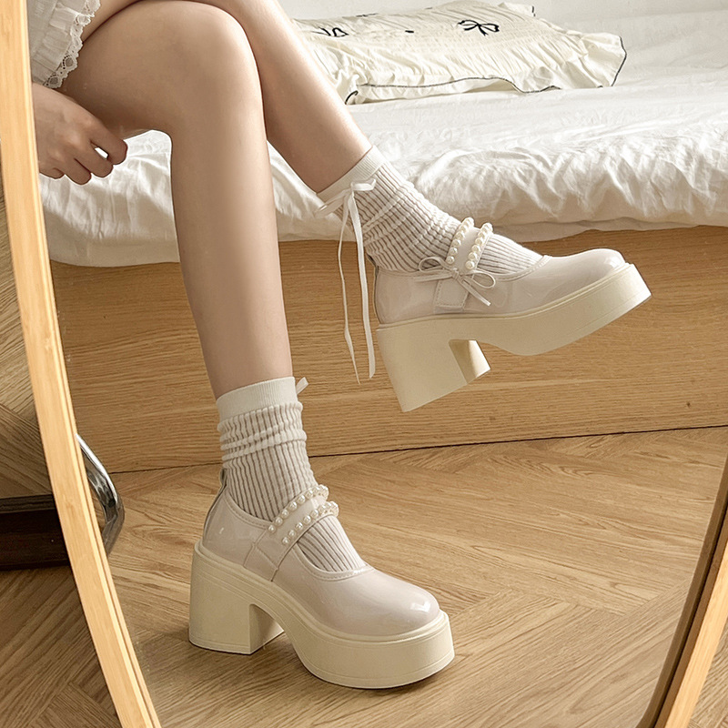 여성을위한 프랑스 진주 나비 매듭 두꺼운 밑창 두꺼운 굽 작은 가죽 신발 2025 새로운 봄, 여름 작은 두꺼운 굽 메리 제인 신발스토어 가기
