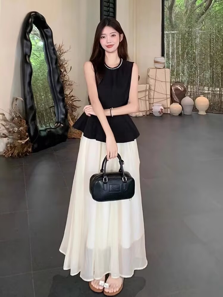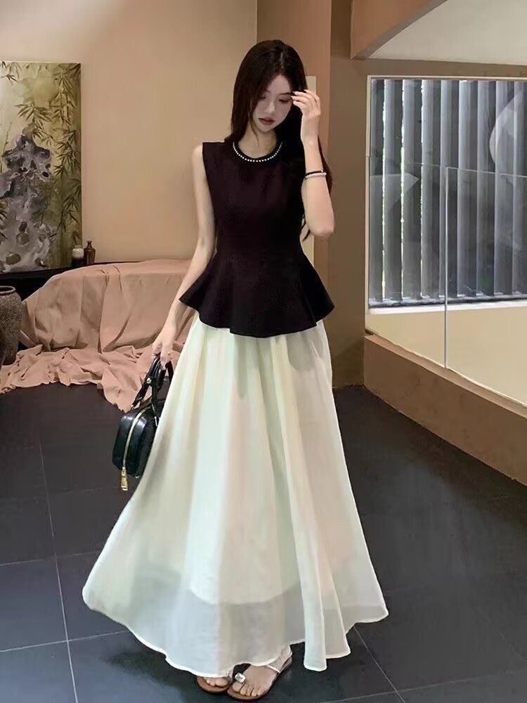 여름 2025 여성을 위한 여왕 스타일의 다양한 스타일의 비즈 민소매 드레스 새로운 틈새 디자인 대형 스커트 롱 스커트