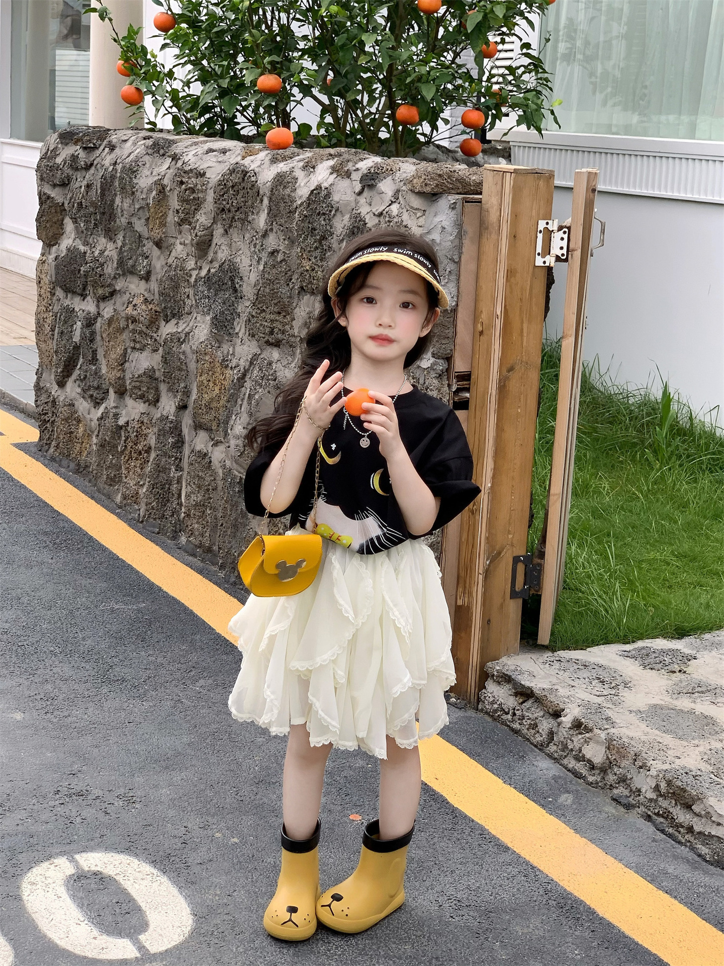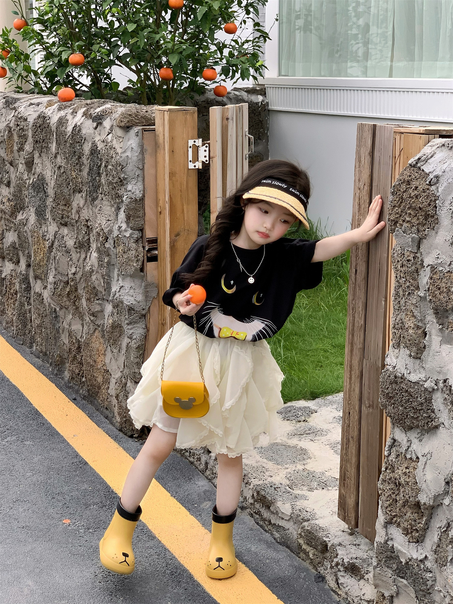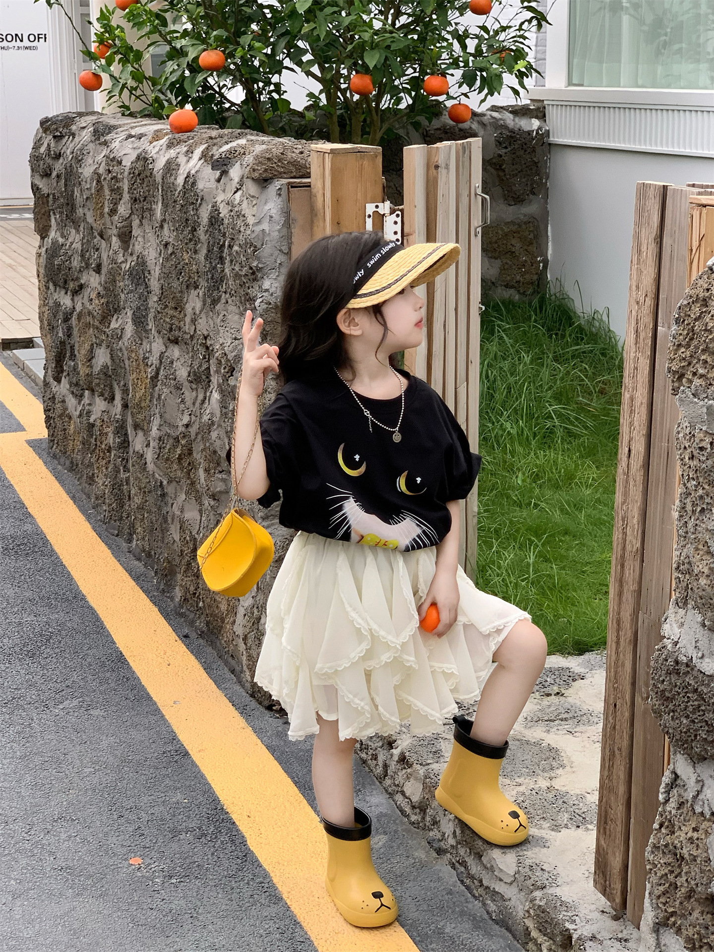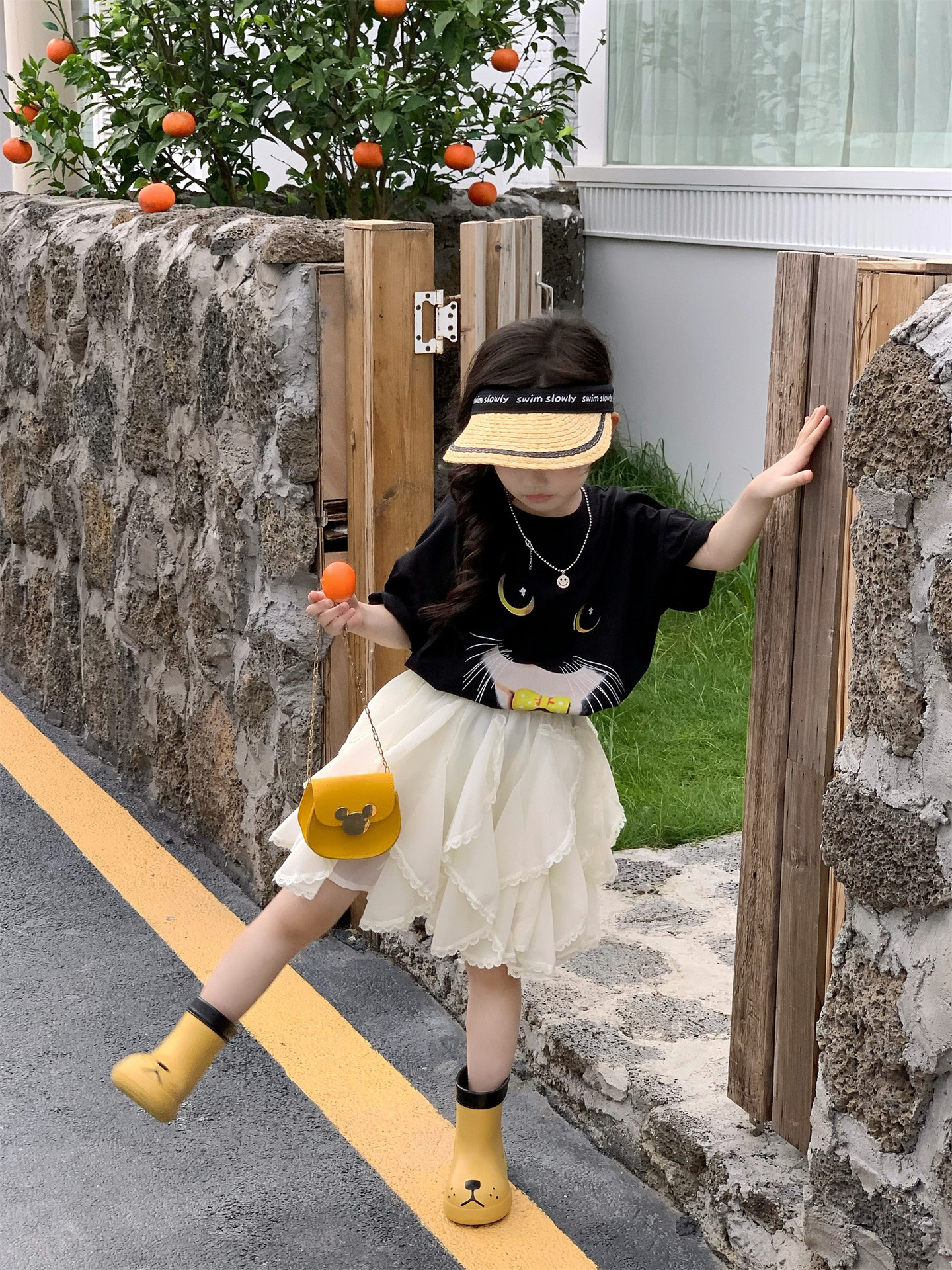 2025 새로운 여름 소녀 만화 고양이 반팔 티셔츠 + 세련된 접이식 거즈 쉬폰 스커트 투피스 세트스토어 가기
