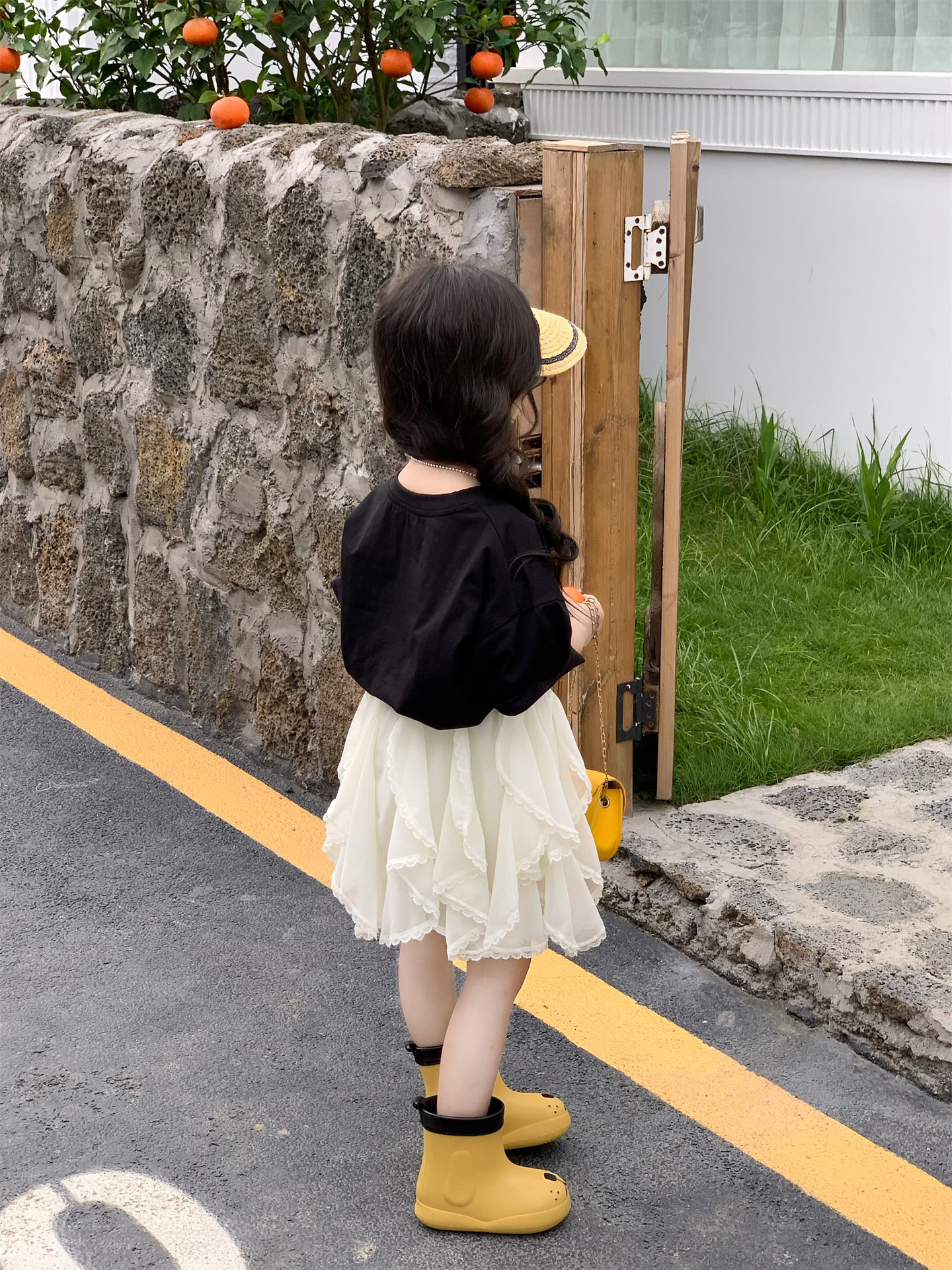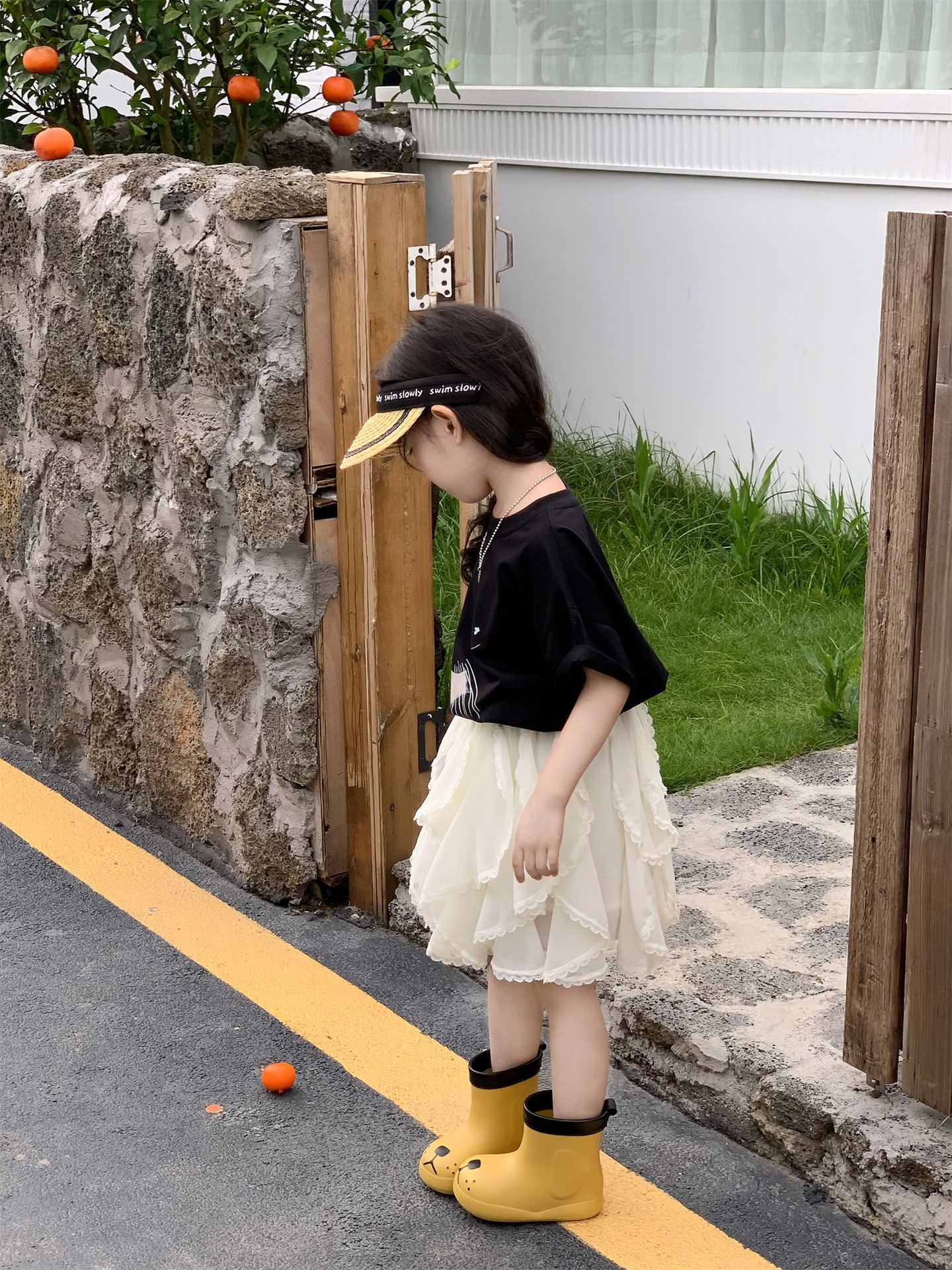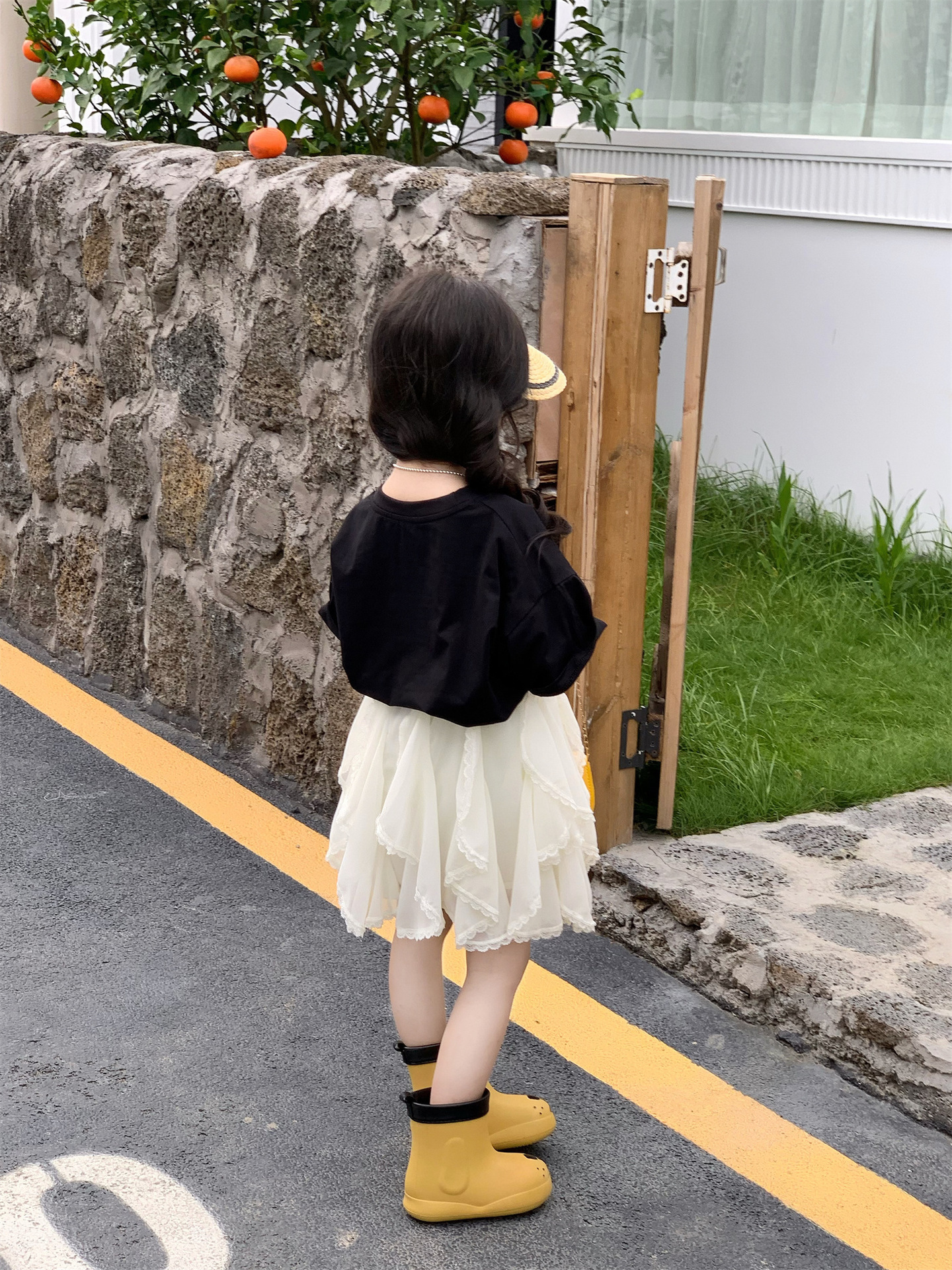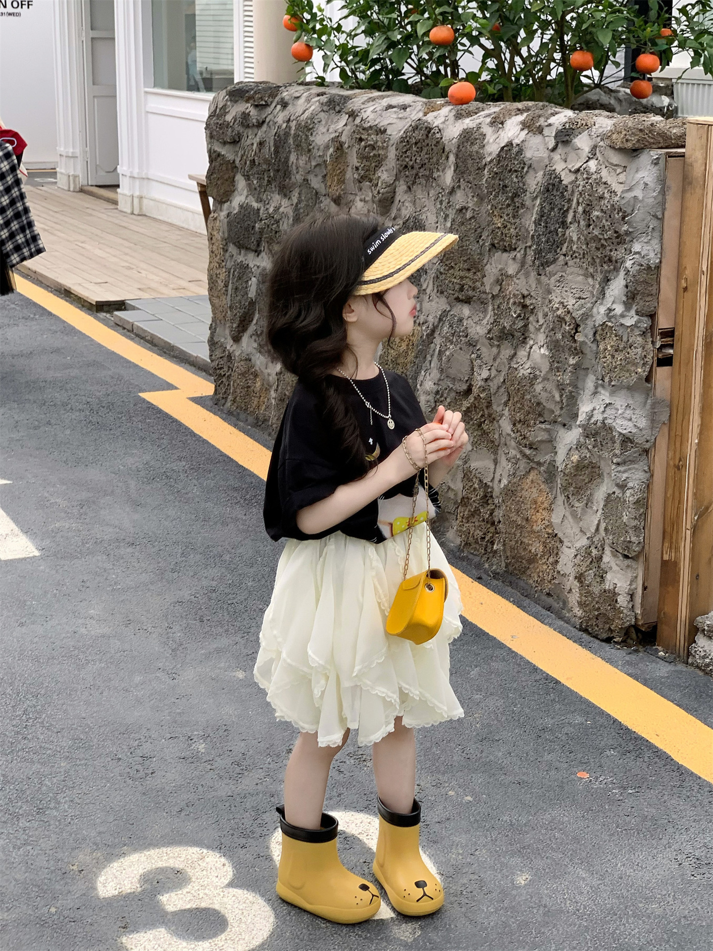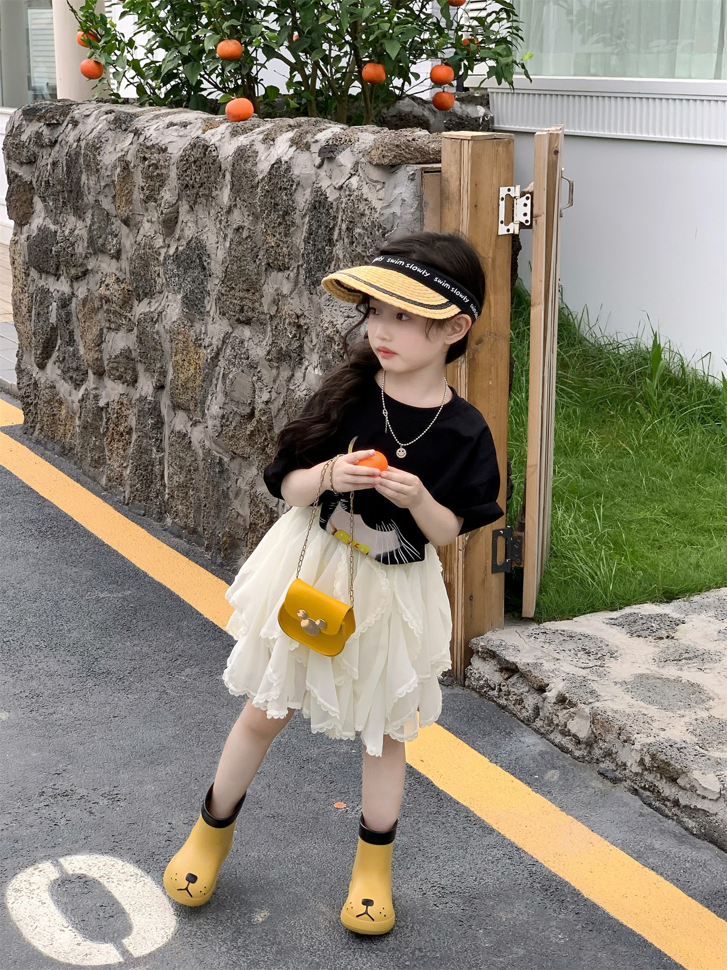 2025 새로운 여름 소녀 만화 고양이 반팔 티셔츠 + 세련된 접이식 거즈 쉬폰 스커트 투피스 세트스토어 가기