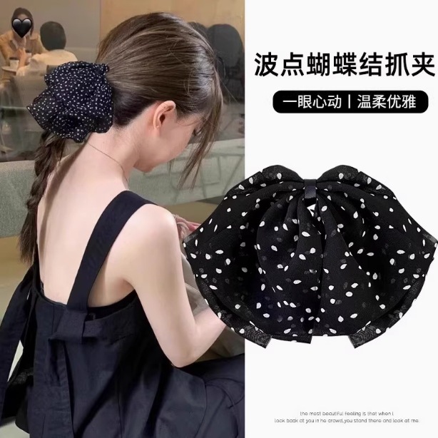 • F1465 블랙 폴카 도트 3겹 메쉬 보우 포니테일 클립