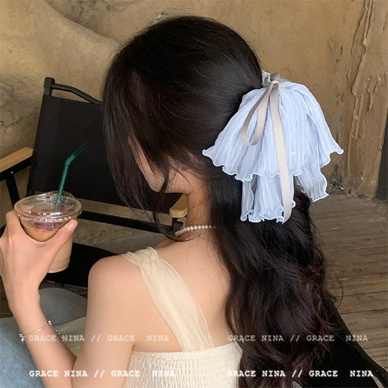 • F1448 블루 메쉬 리본 보우 포니테일 클립