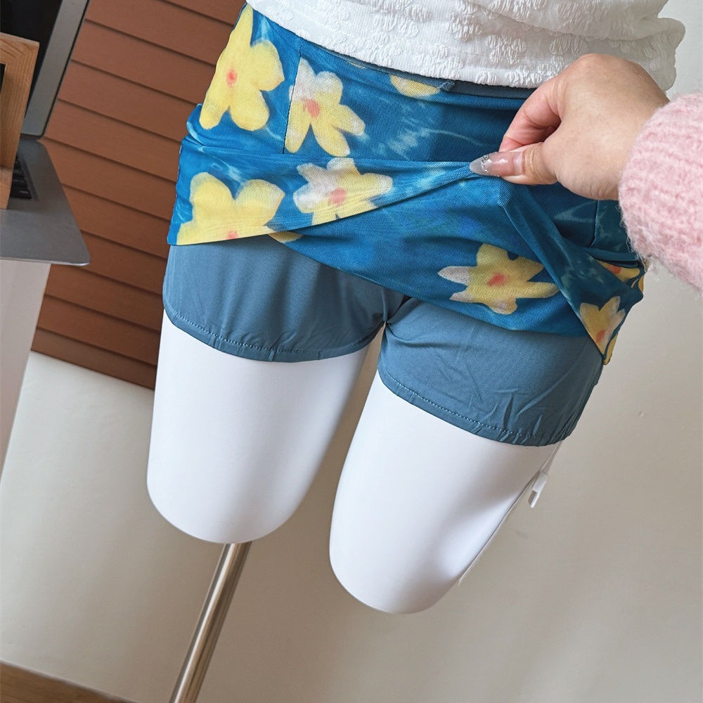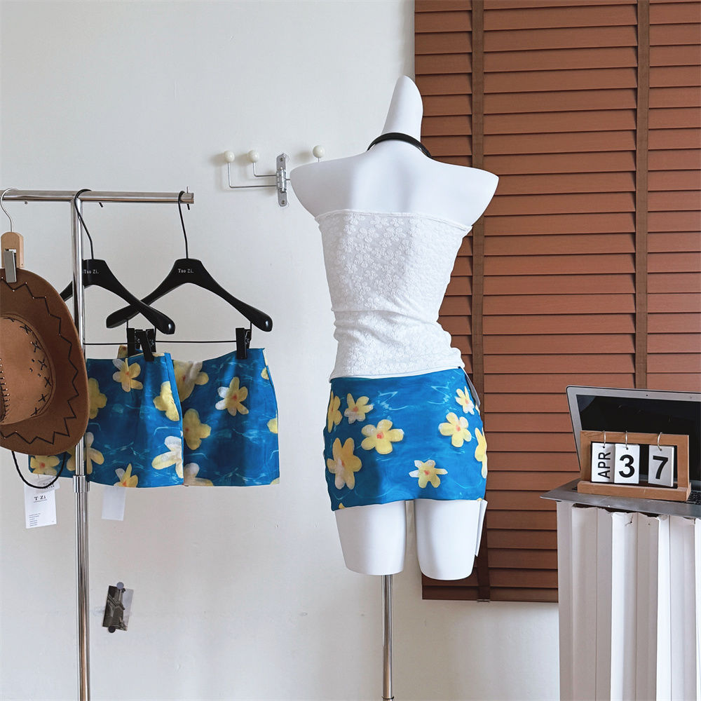 여름 휴가 손으로 그린 계란 꽃 메쉬 스커트 여성 달콤한 매력 순수한 정욕 스타일 낮은 허리 힙 커버 슈퍼 짧은 스커트