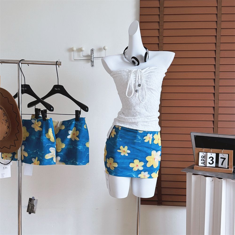 여름 휴가 손으로 그린 계란 꽃 메쉬 스커트 여성 달콤한 매력 순수한 정욕 스타일 낮은 허리 힙 커버 슈퍼 짧은 스커트스토어 가기