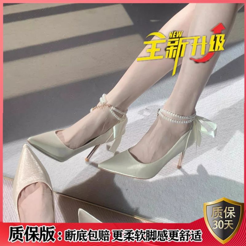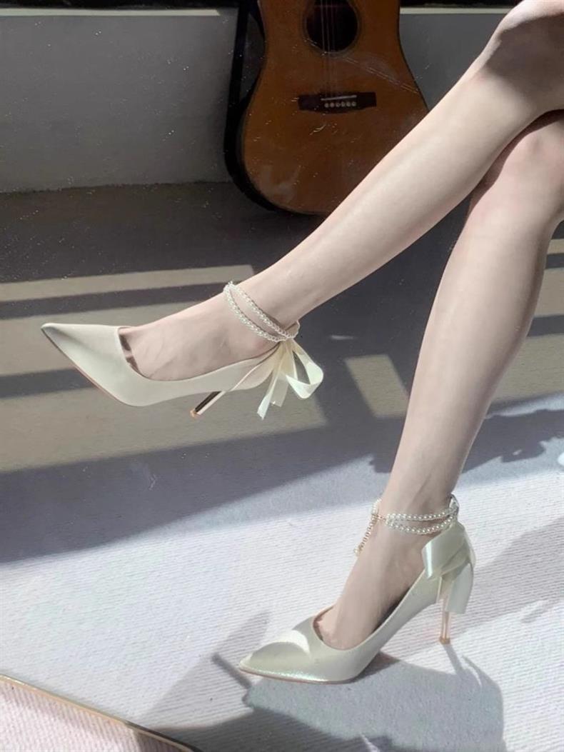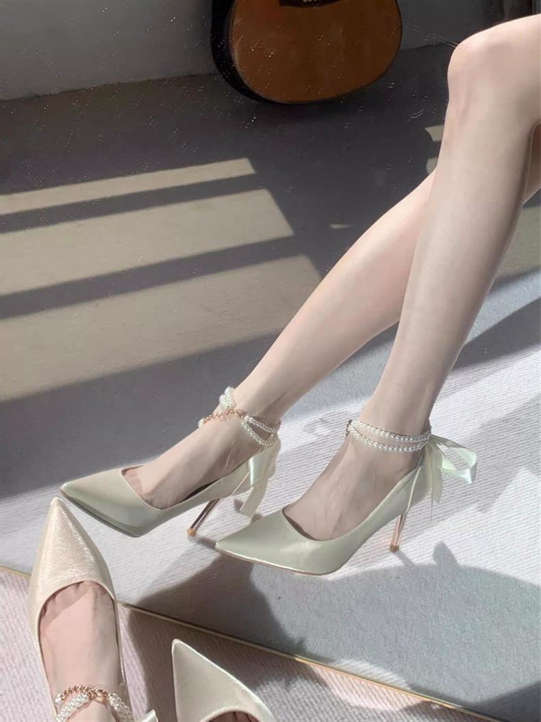 데일리로 신을 수 있는 새틴 슈즈, 화이트 프렌치 하이힐, 드레스, 웨딩슈즈, 성인식, 신부 들러리 신부 웨딩드레스