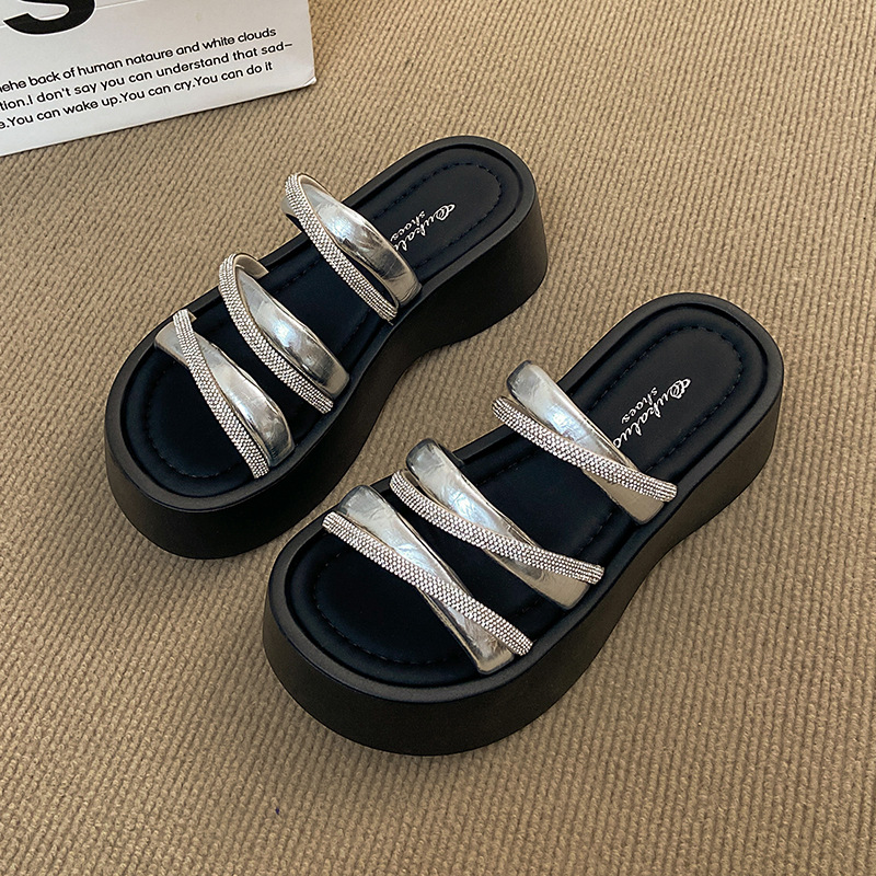 여성용 여름 아우터용 라인스톤 두꺼운 밑창 슬리퍼 2025 여름 신작 패션 오픈 토우 비치 비치 슬리퍼