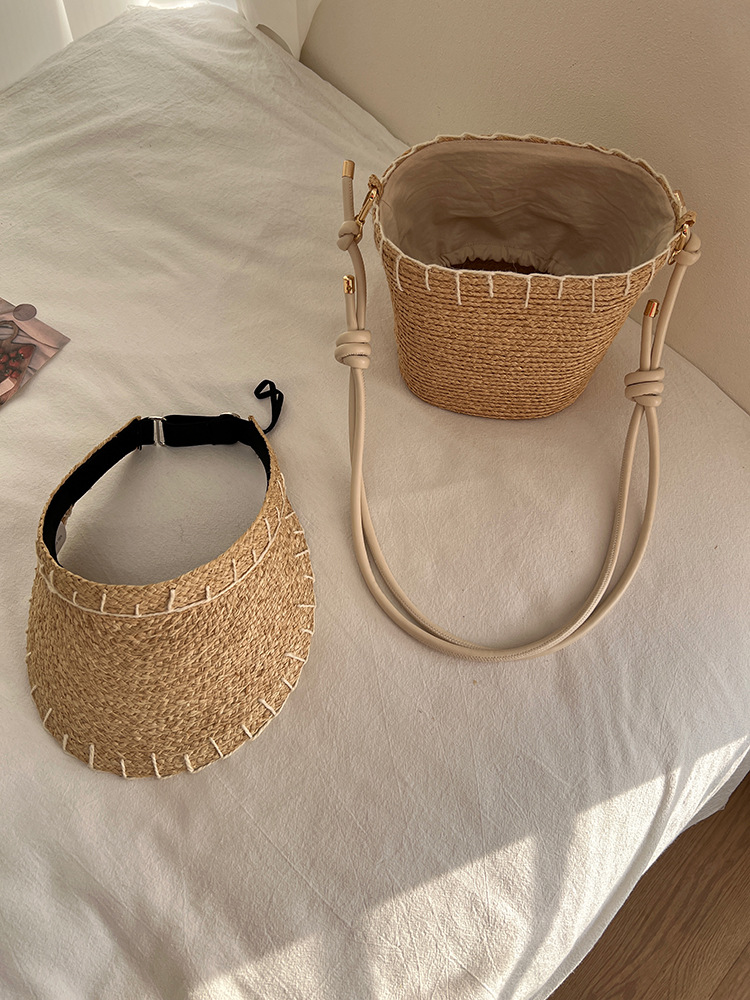 여름 야외 태양 보호 빈 탑 밀짚 모자 해변 휴가 스타일 비치 숄더 백 여성을위한 수입 라피아 가방 및 모자
