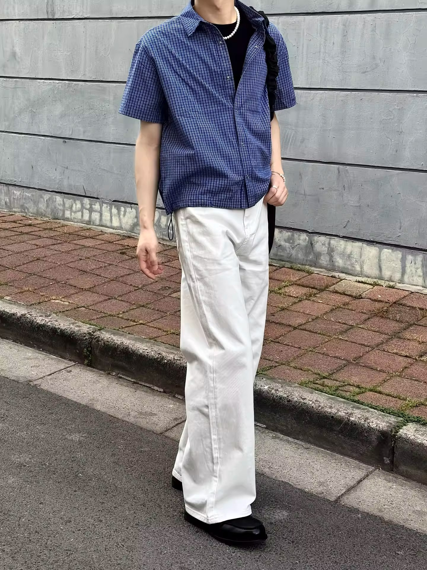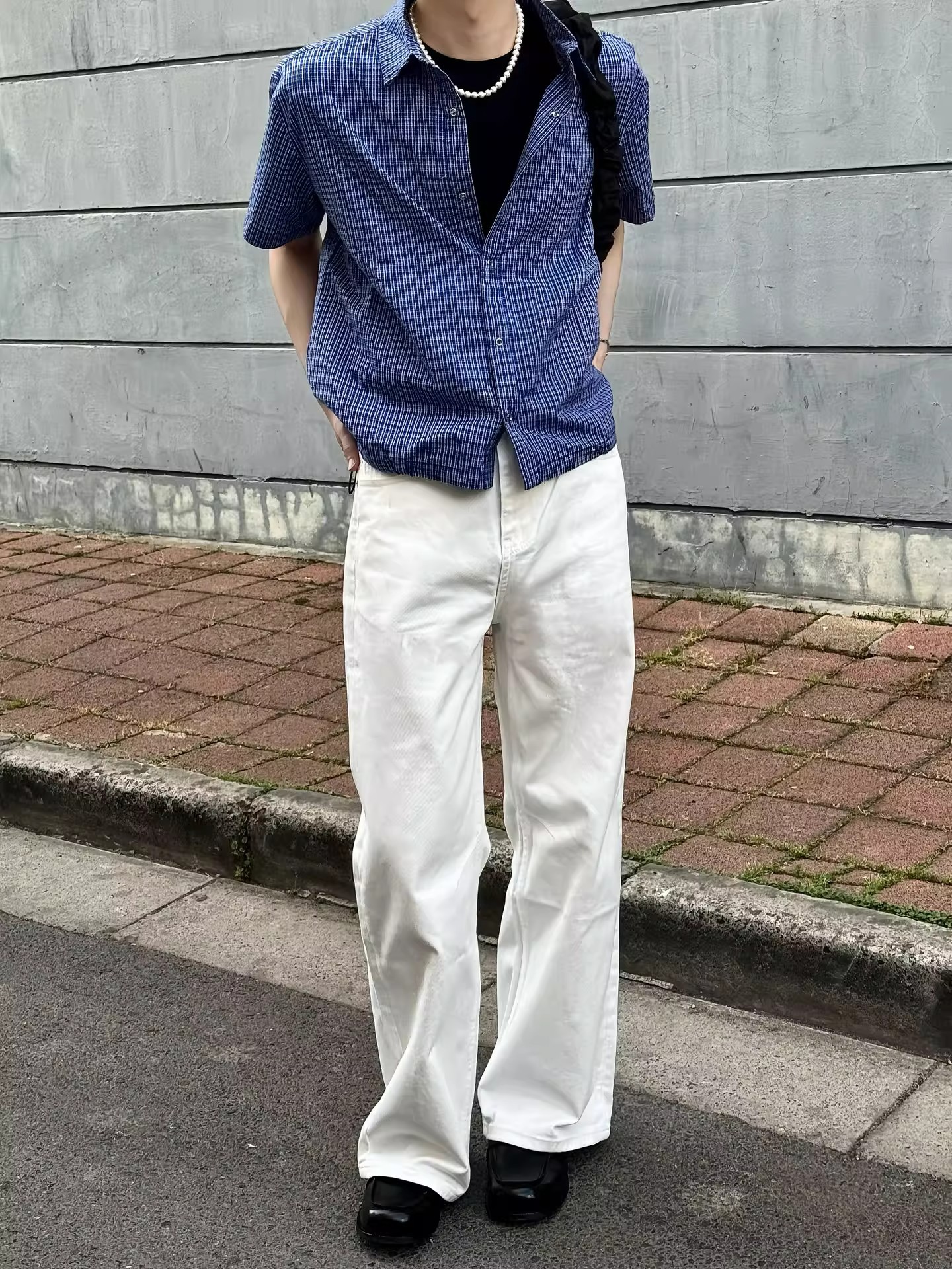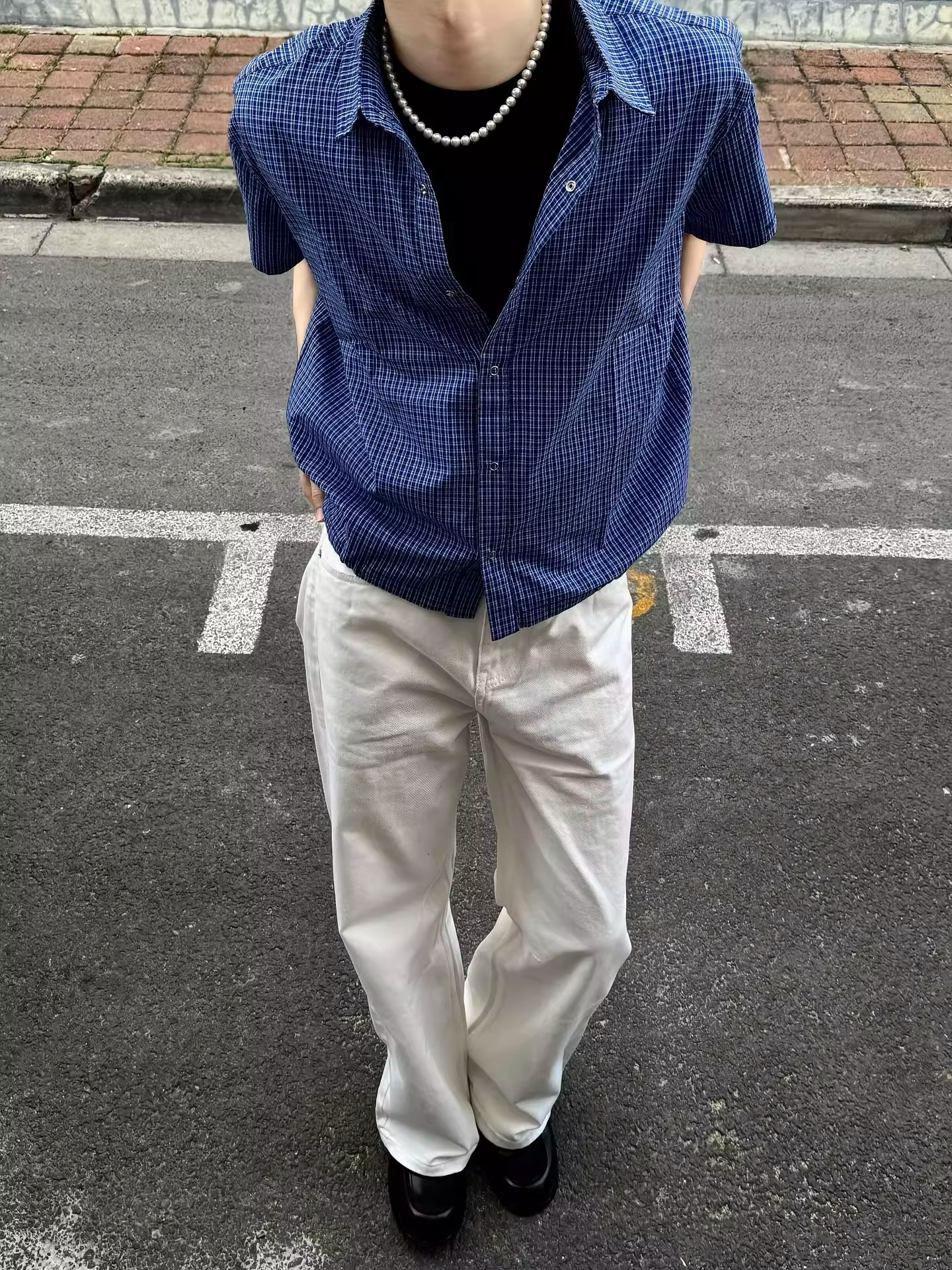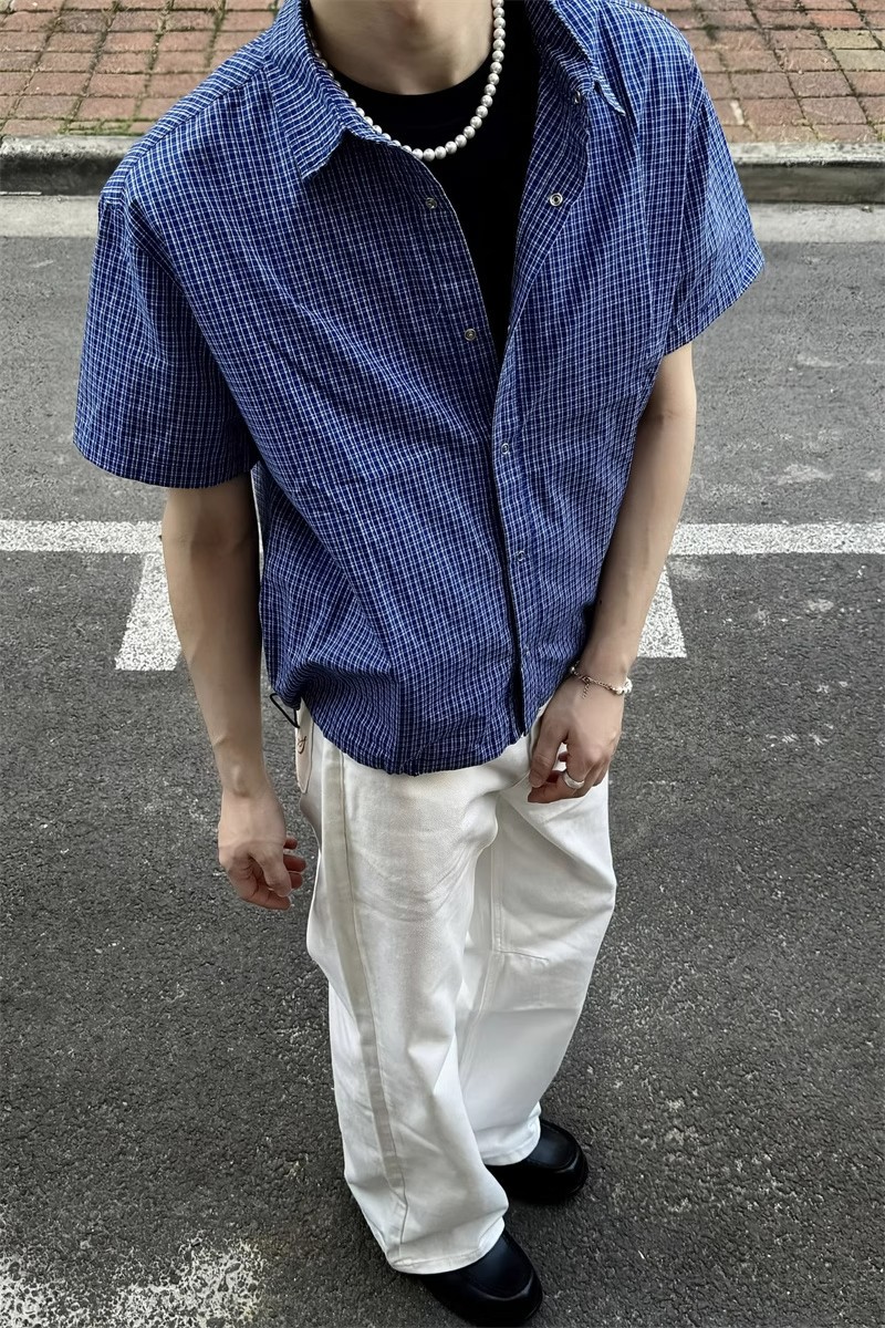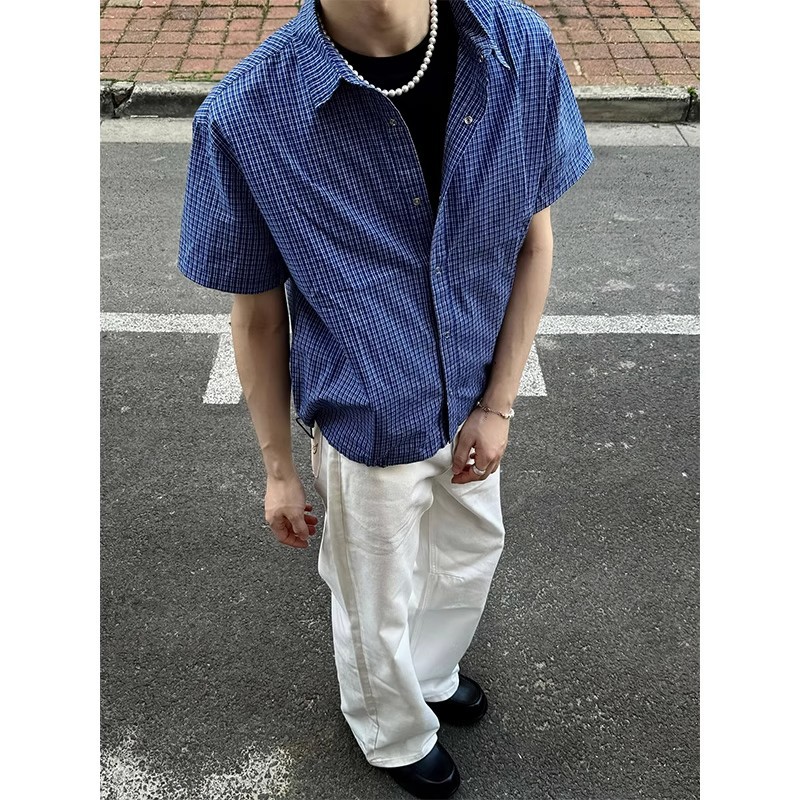 블루 체크 무늬 반팔 셔츠 남성 여름 얇은 버튼 다섯 개 디자인 셔츠 클린핏 오른쪽 어깨 반소매스토어 가기