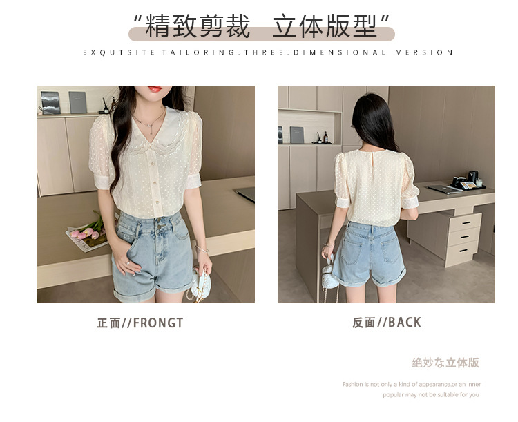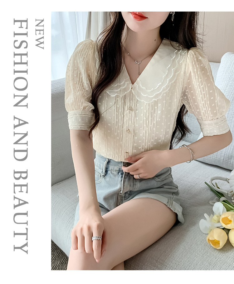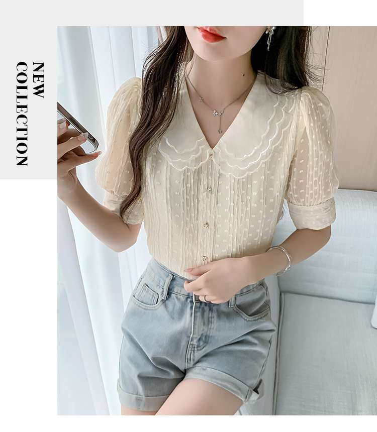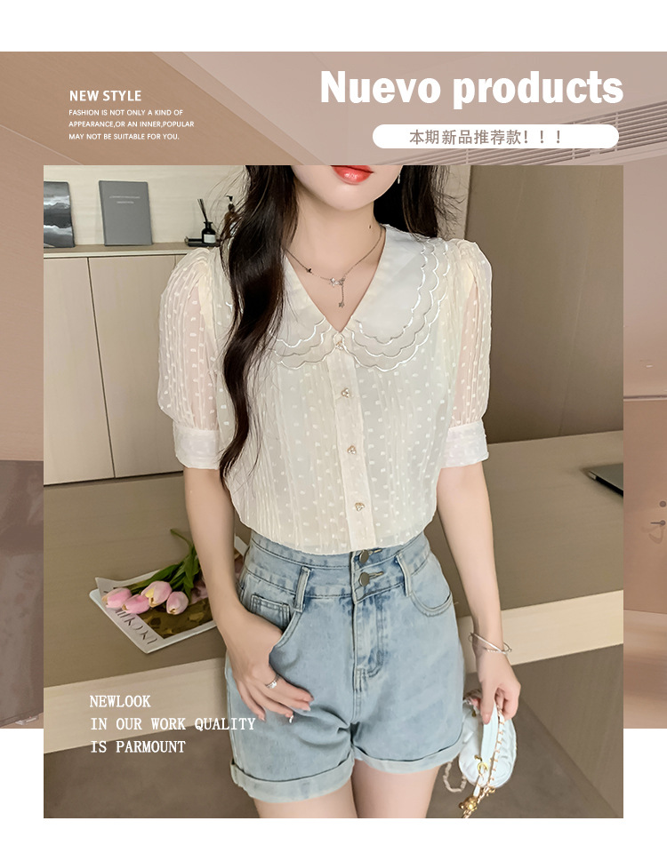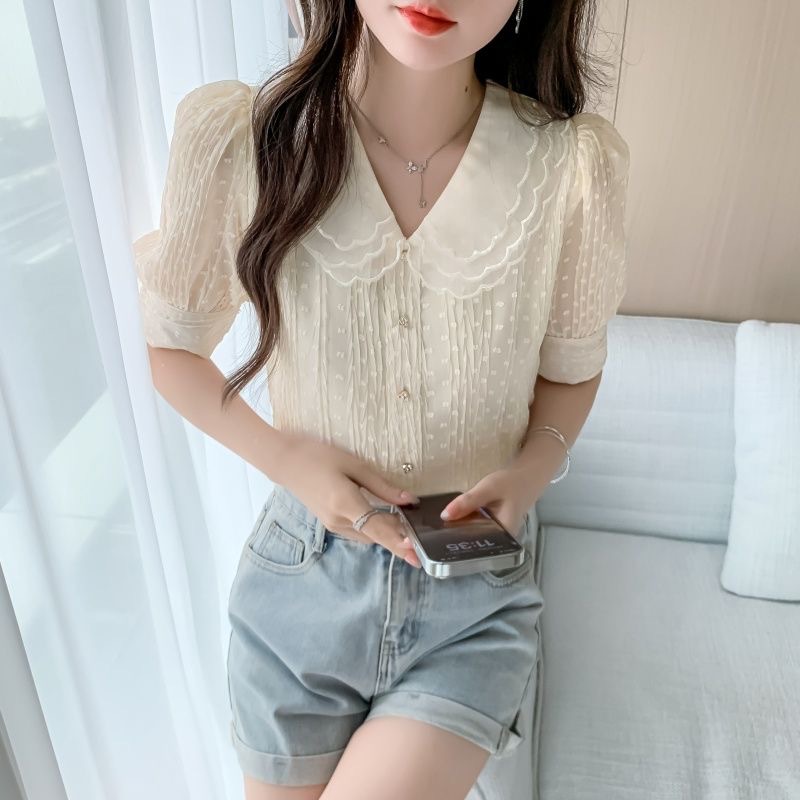 2025년 여름 여성을 위한 새로운 반팔 인형 칼라 쉬폰 셔츠, 달콤한 기질, 연령 감소 퍼프 슬리브 틈새 상의
