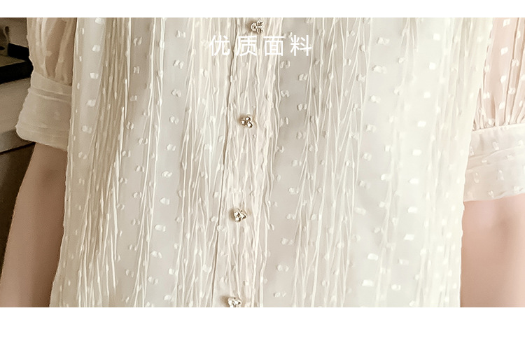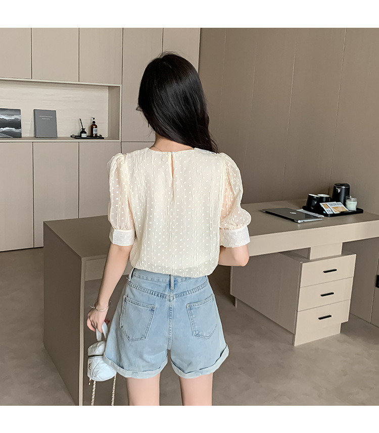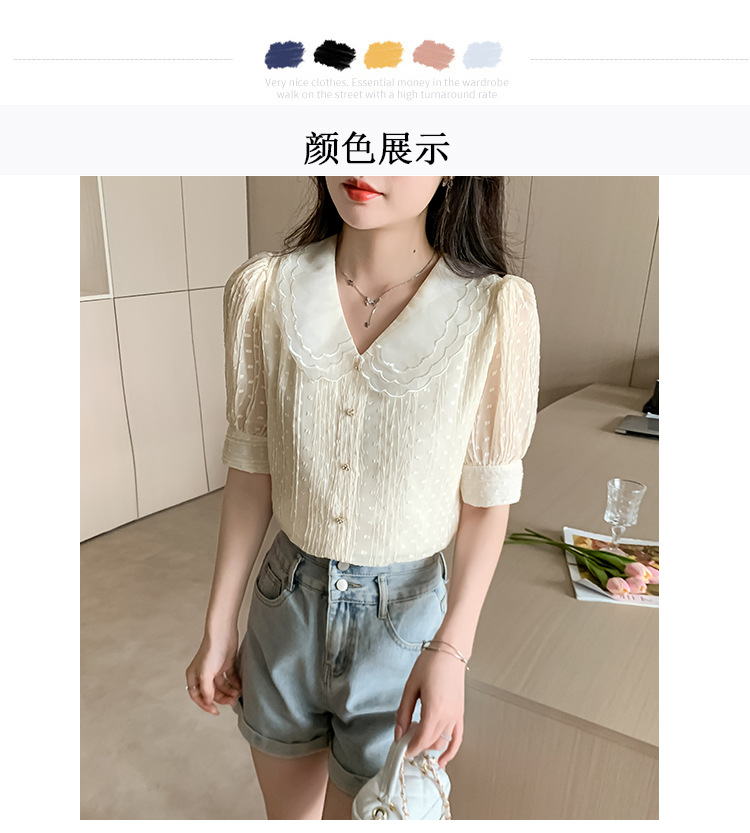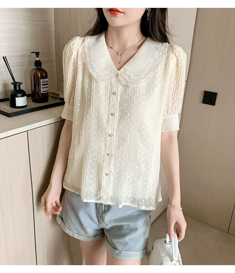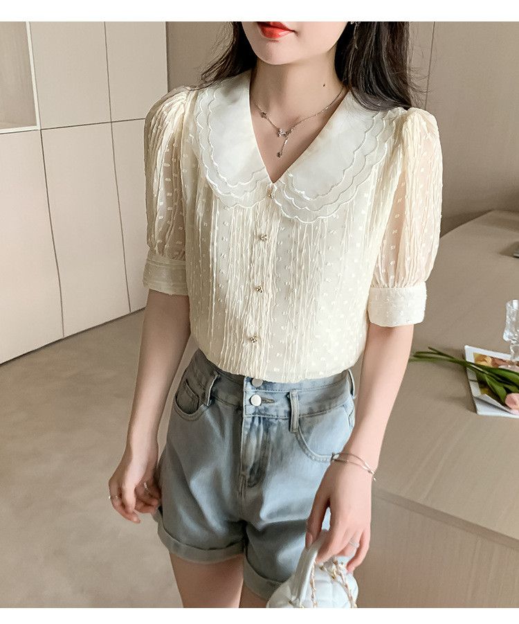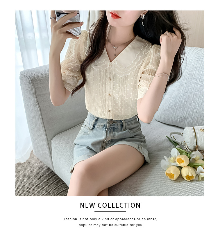 2025년 여름 여성을 위한 새로운 반팔 인형 칼라 쉬폰 셔츠, 달콤한 기질, 연령 감소 퍼프 슬리브 틈새 상의