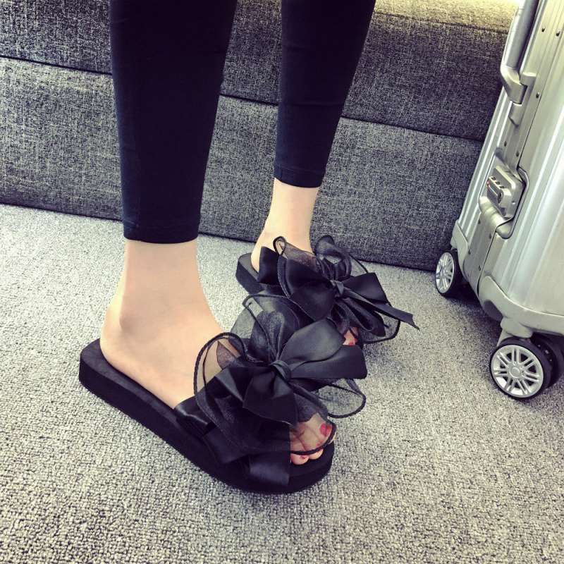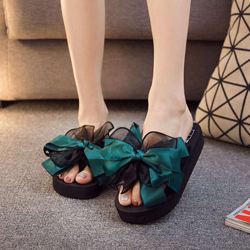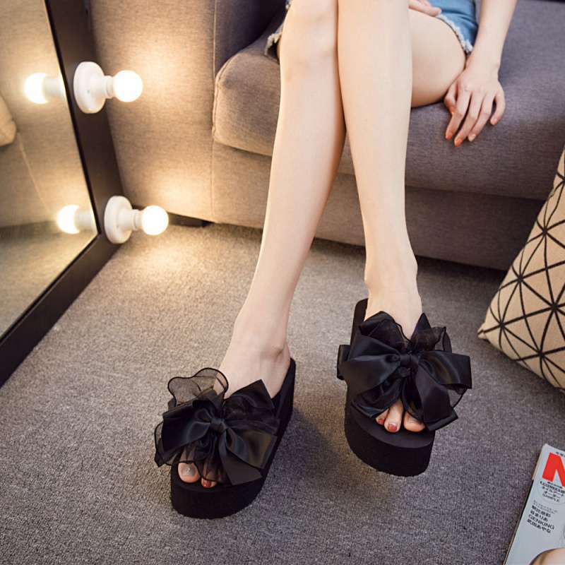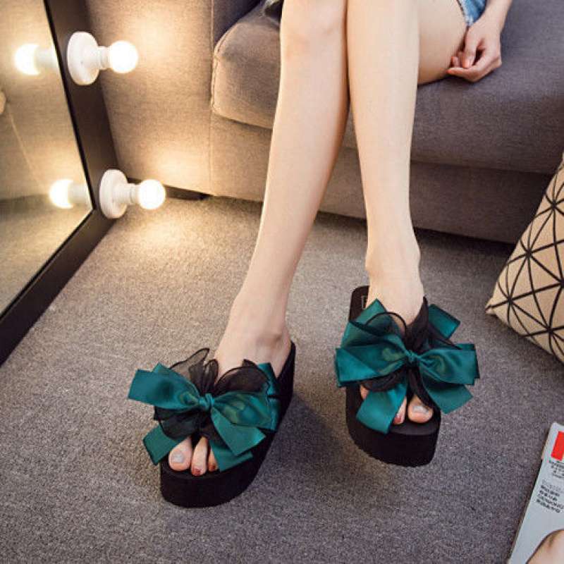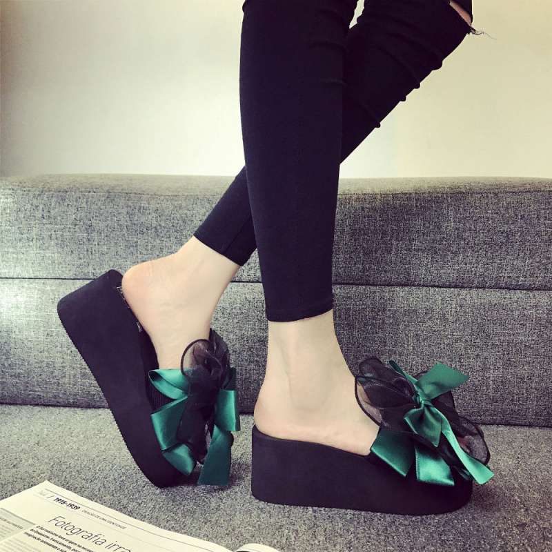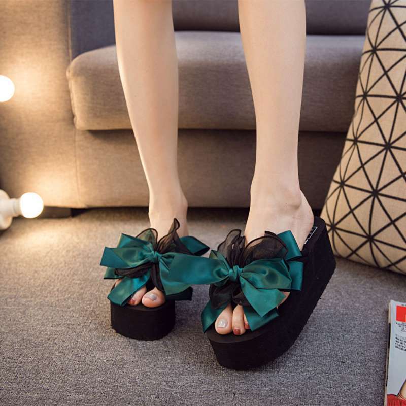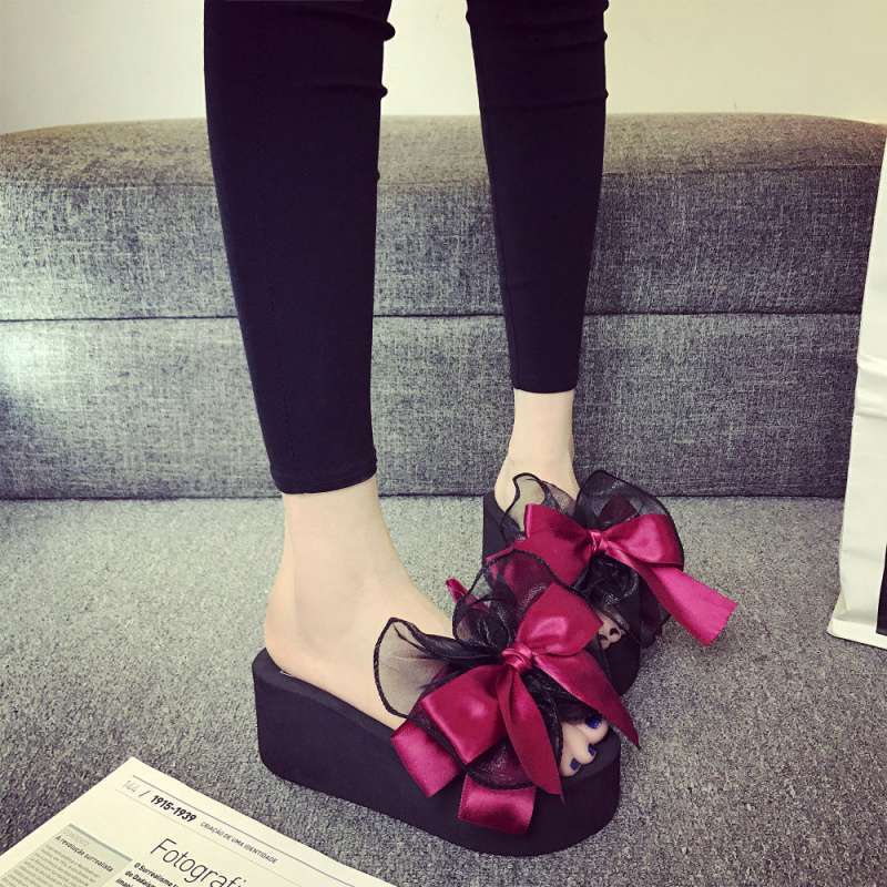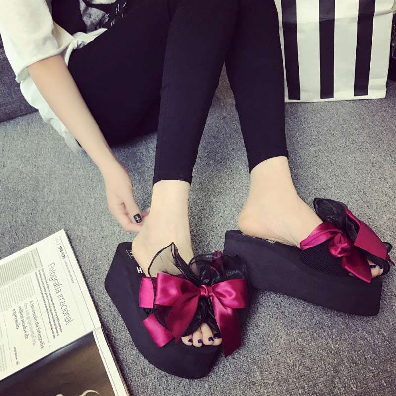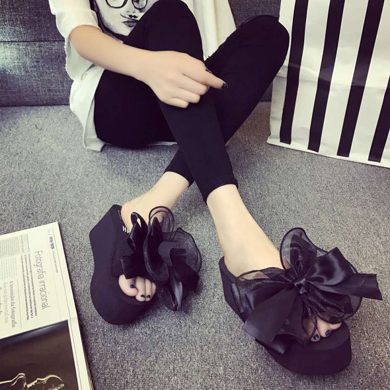 2025 여름 한국 버전 나비 매듭 웨지 샌들 여성 패션 겉옷 두꺼운 밑창 비치 신발 미끄럼 방지 하이힐 플립 플롭