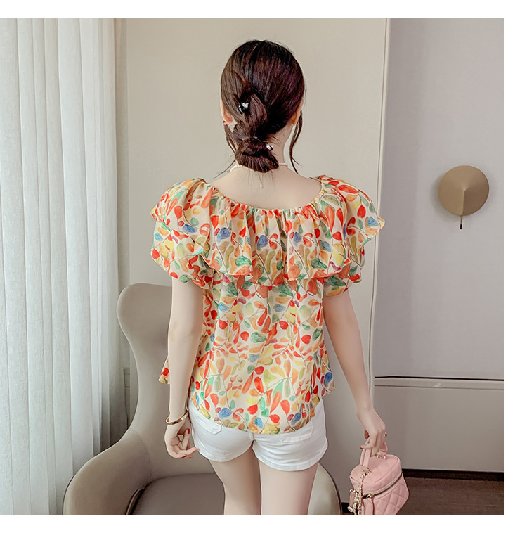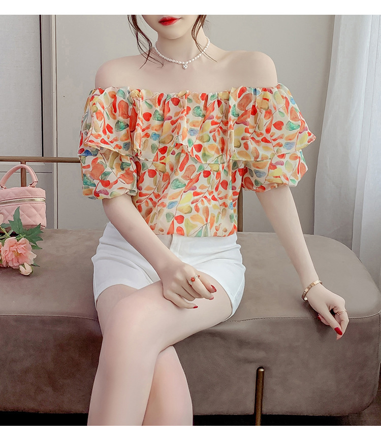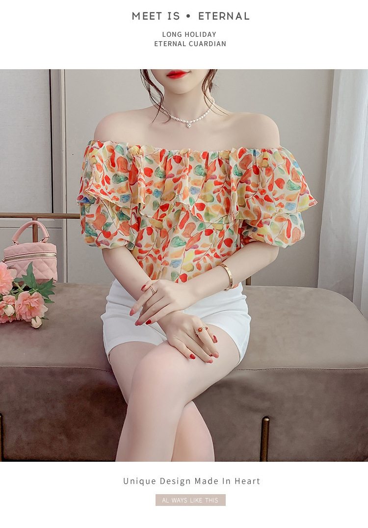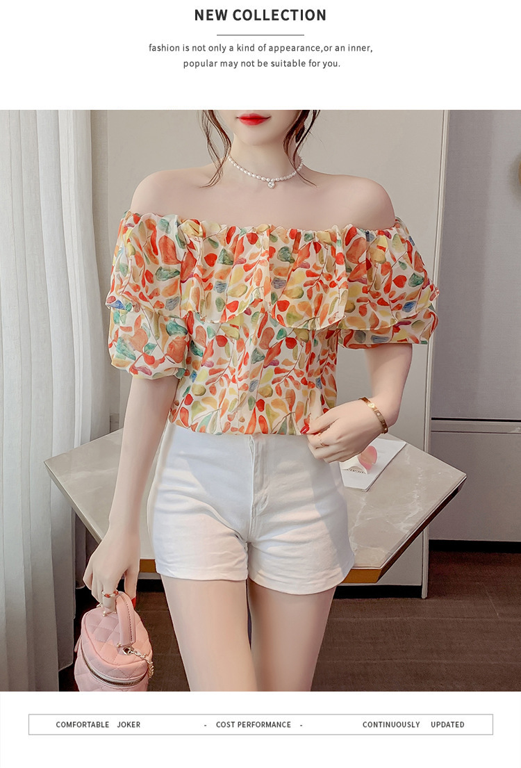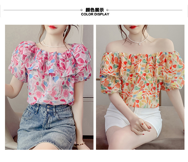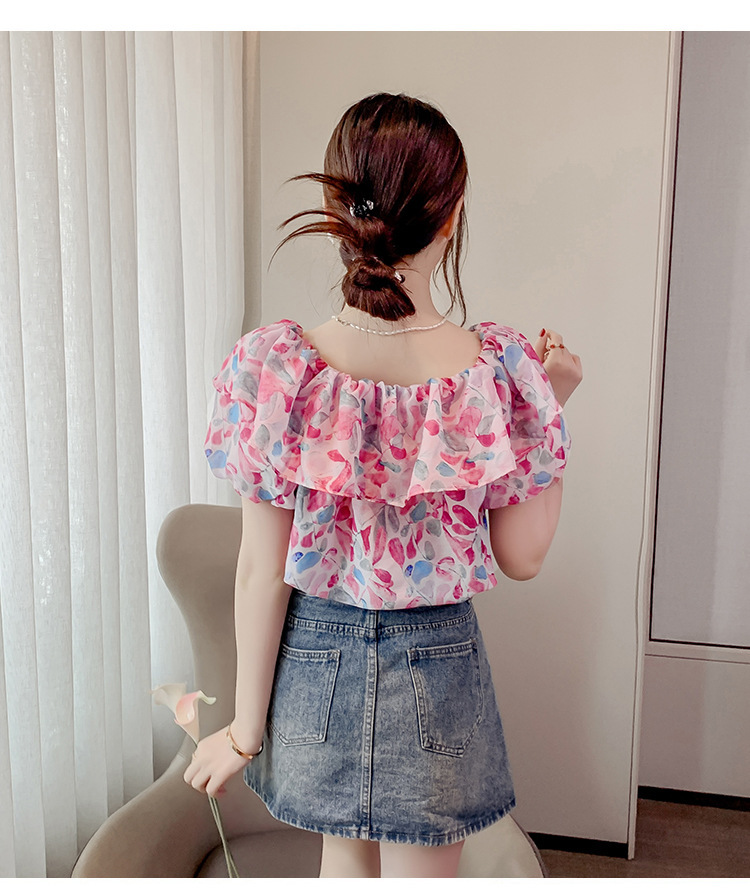 반팔 핫걸 스퀘어 넥 꽃 프렌치 레트로 여름 반팔 셔츠 쉬폰 원 숄더 짧은 배 노출 새로운 스타일