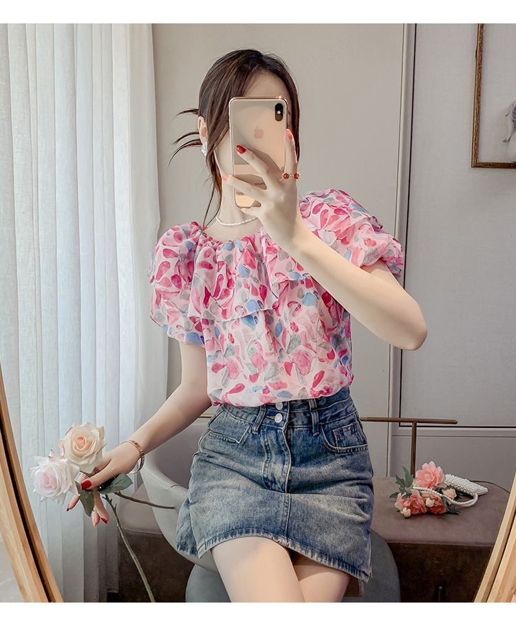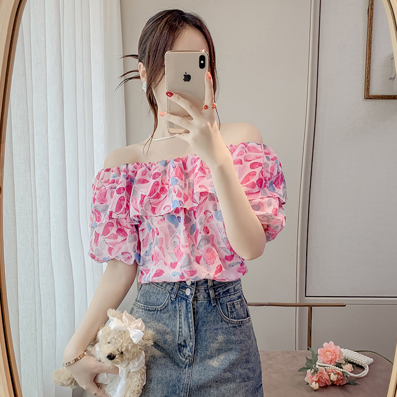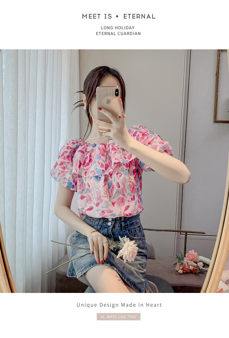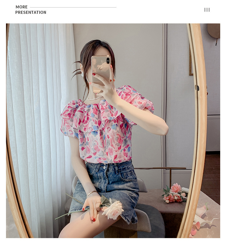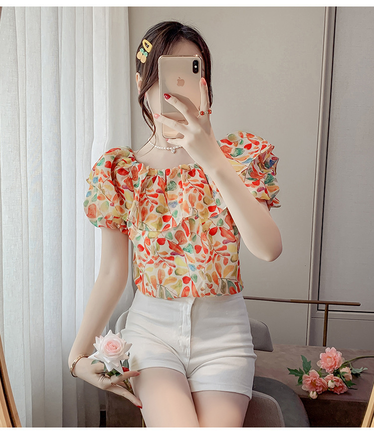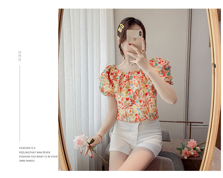반팔 핫걸 스퀘어 넥 꽃 프렌치 레트로 여름 반팔 셔츠 쉬폰 원 숄더 짧은 배 노출 새로운 스타일스토어 가기