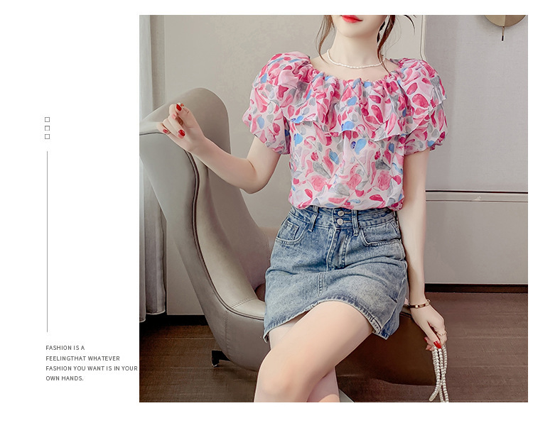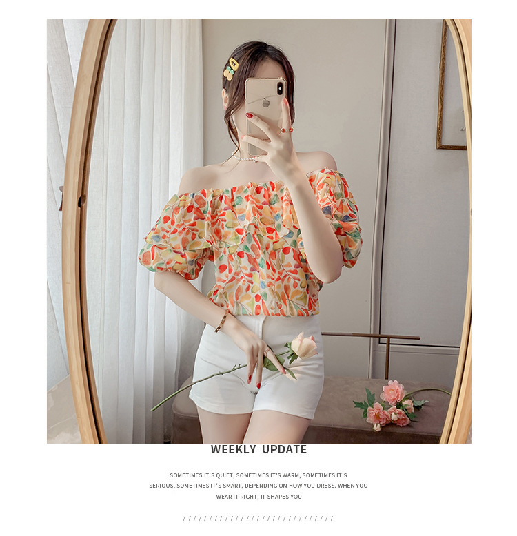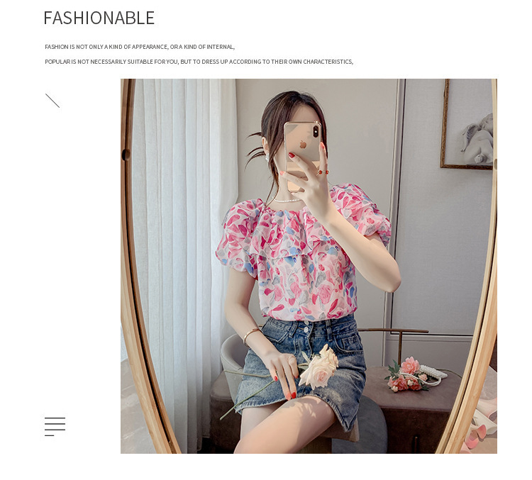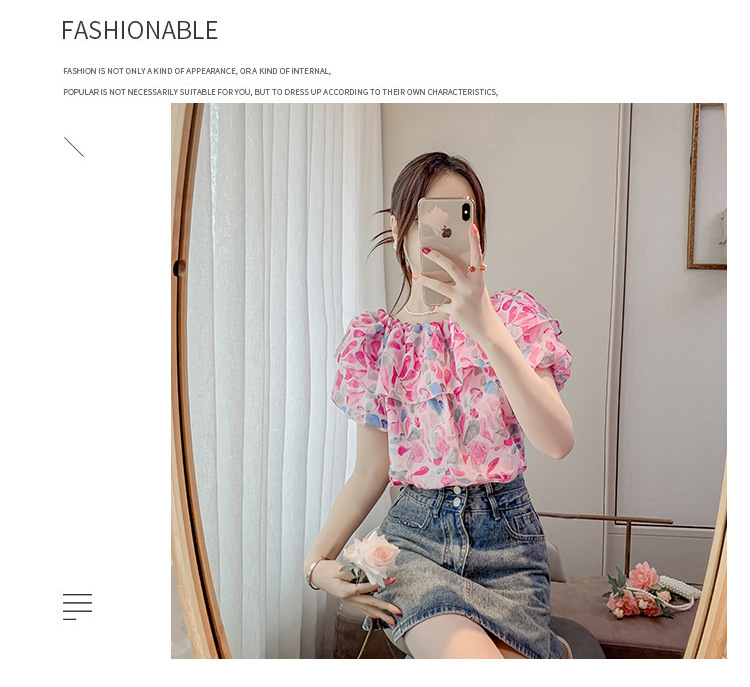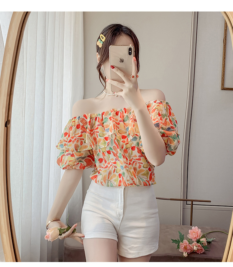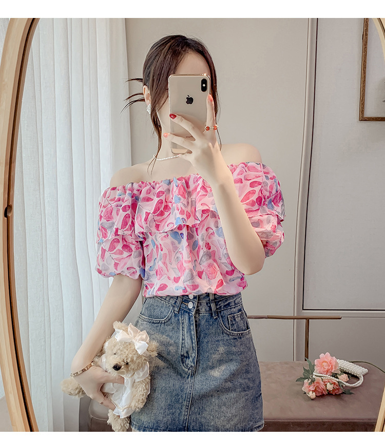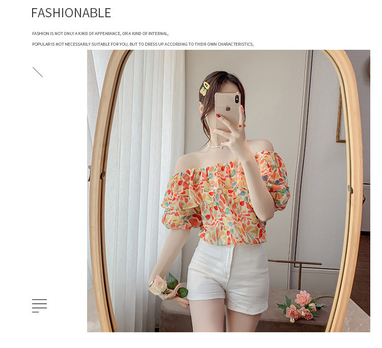 반팔 핫걸 스퀘어 넥 꽃 프렌치 레트로 여름 반팔 셔츠 쉬폰 원 숄더 짧은 배 노출 새로운 스타일스토어 가기