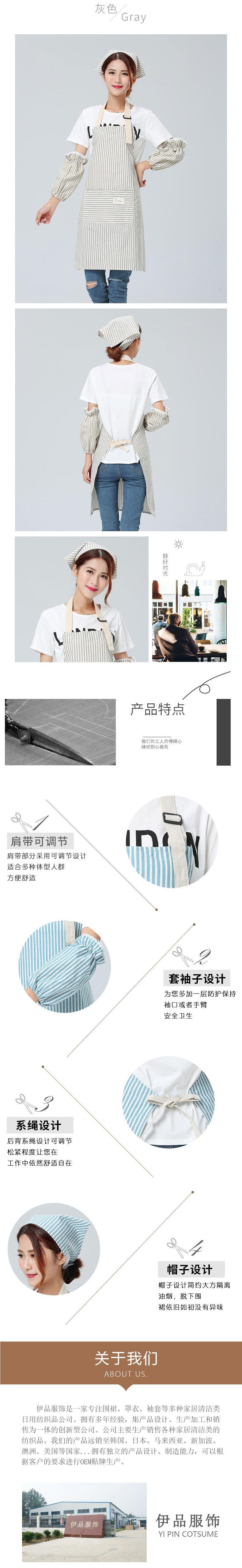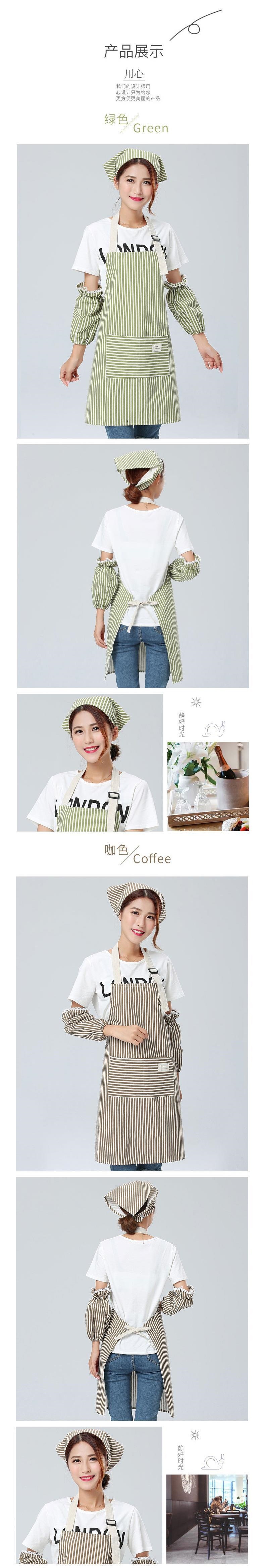 Yijia Yipin 스트라이프 앞치마 3피스 슬리브 세트 방오 모자 세트 카페 밀크티 숍 레스토랑 작업복스토어 가기