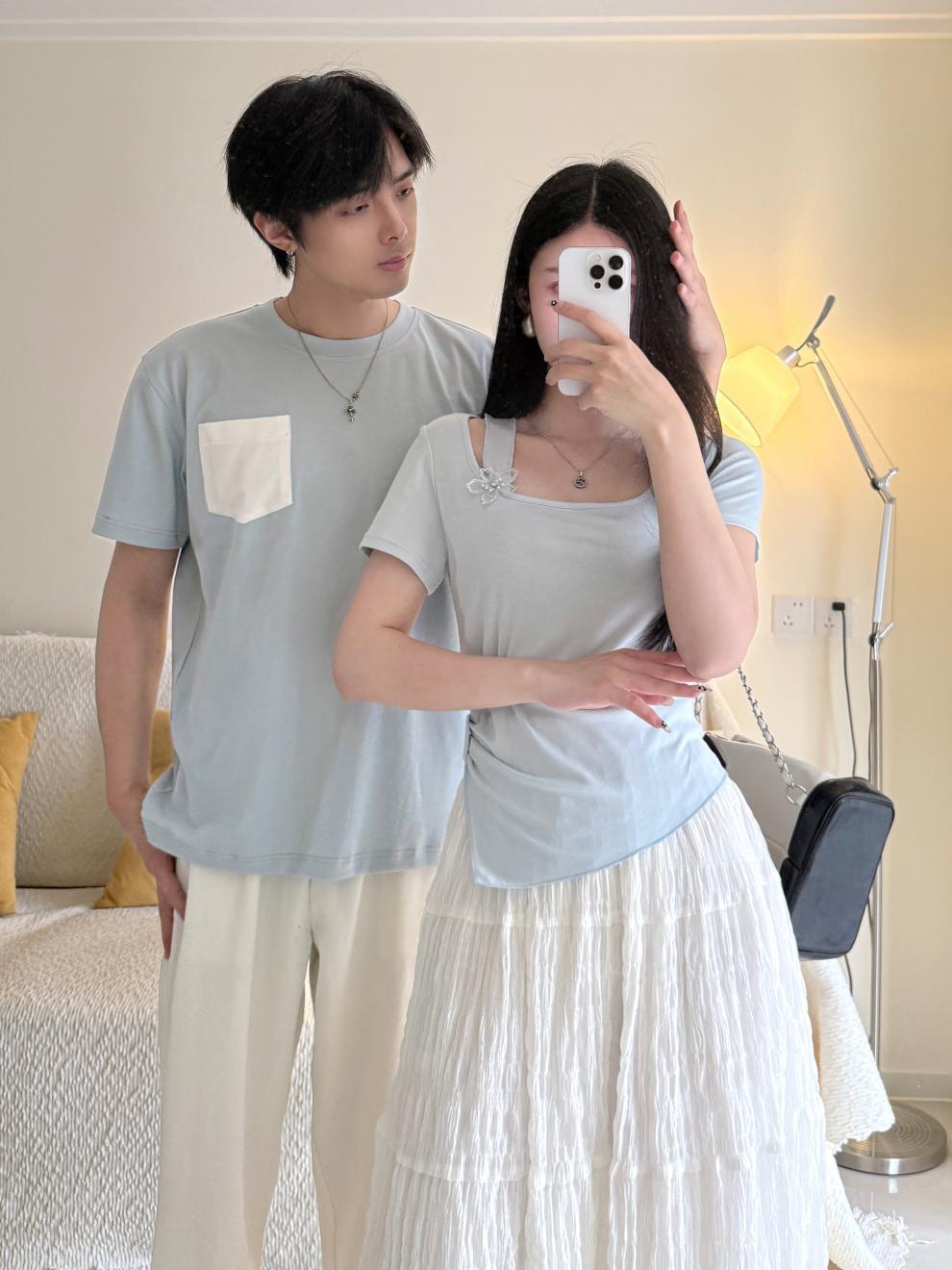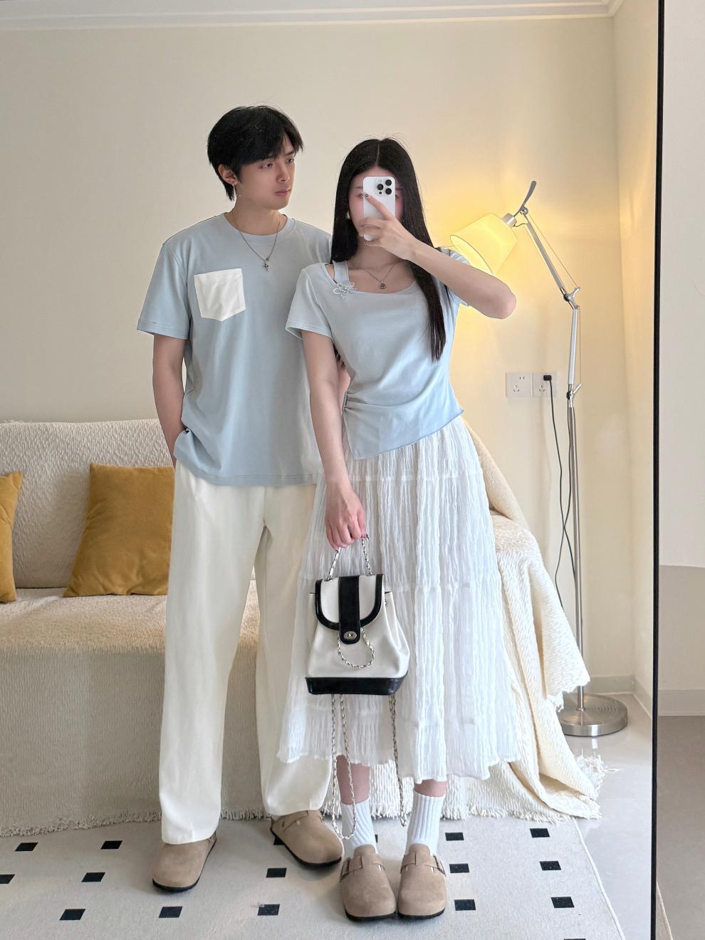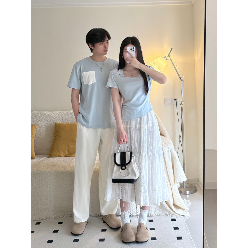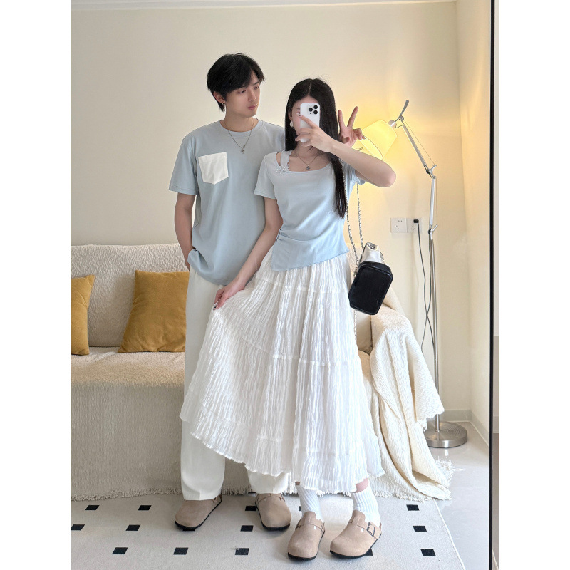 2025 커플 여름 반팔 신작 원 스커트와 원 코트 투피스 세트 여성 및 남성 티셔츠 스커트스토어 가기