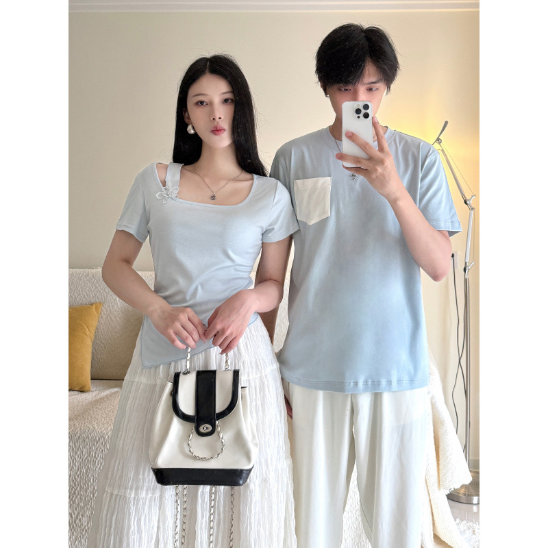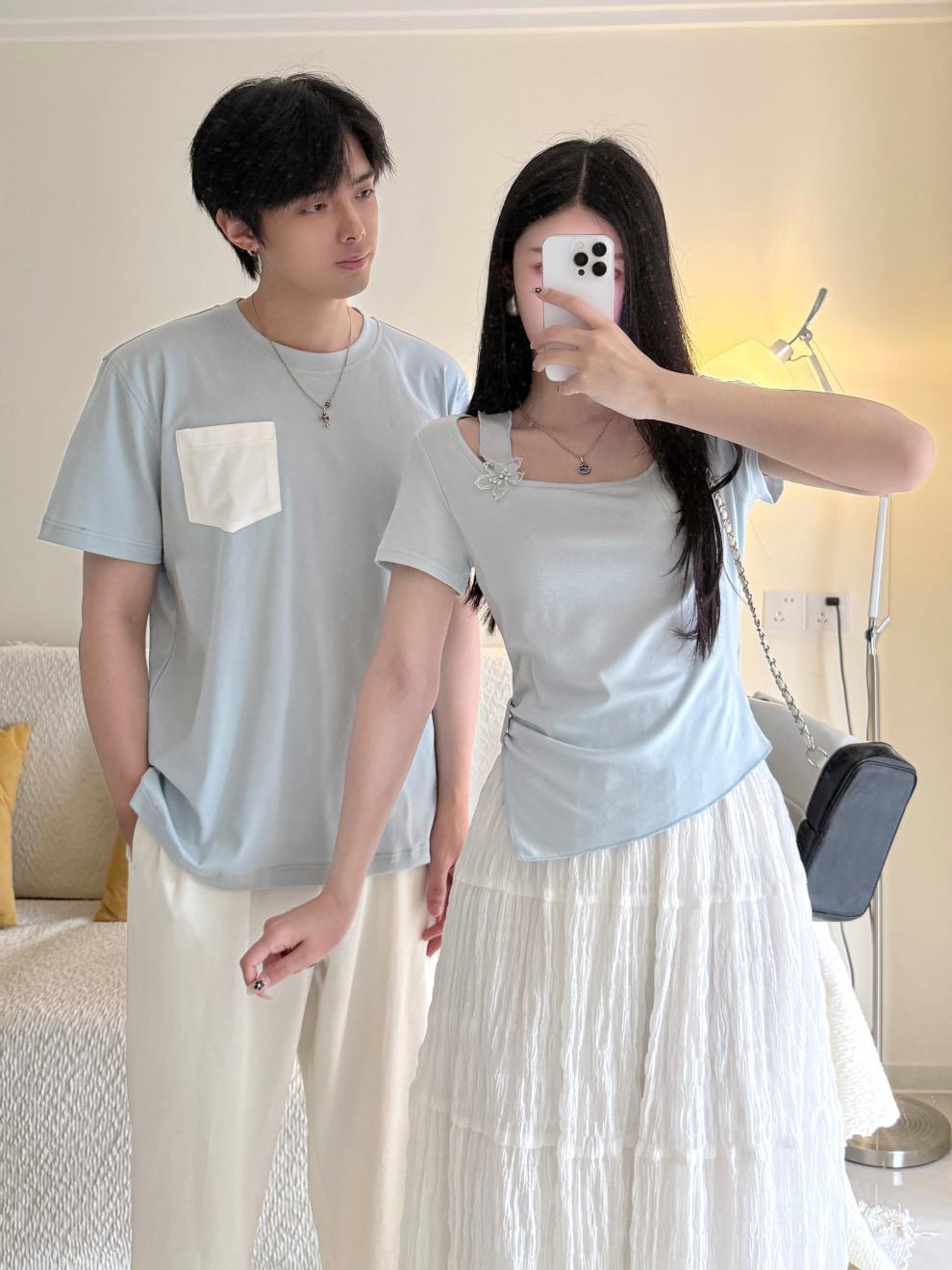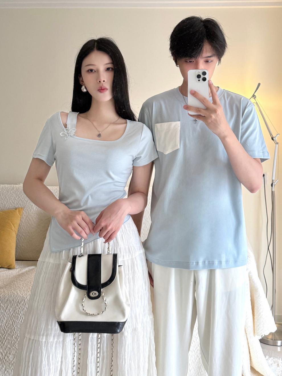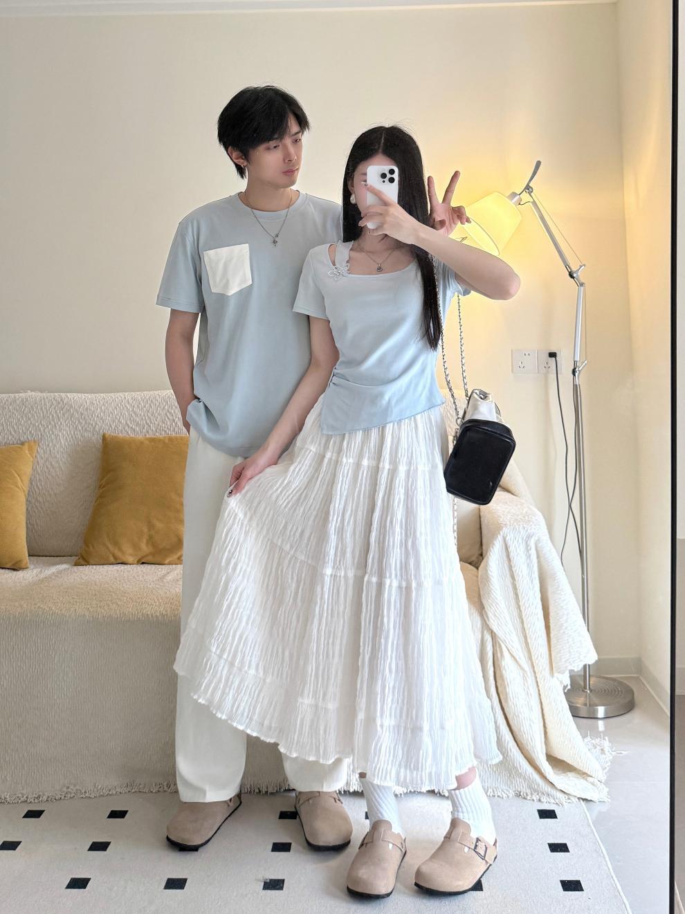 2025 커플 여름 반팔 신작 원 스커트와 원 코트 투피스 세트 여성 및 남성 티셔츠 스커트스토어 가기