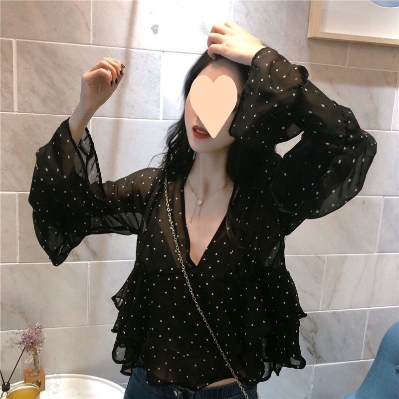한국 스타일 달콤한 러플 폴카 도트 살짝 시스루 쉬폰 셔츠 여성용 칼라 루즈 벨 슬리브 커버 탑 여름스토어 가기