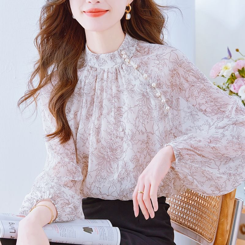 레트로 디자인 프린트 쉬폰 긴팔 셔츠 여성 봄, 가을 새로운 달콤한 기질 셔츠 랜턴 슬리브 탑