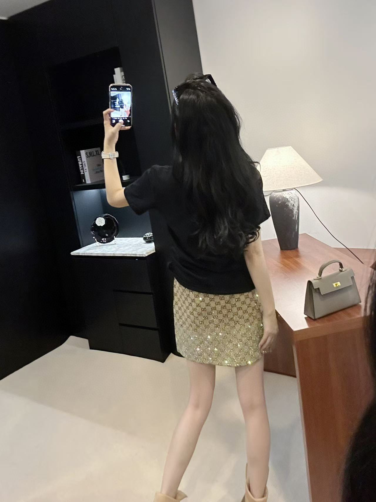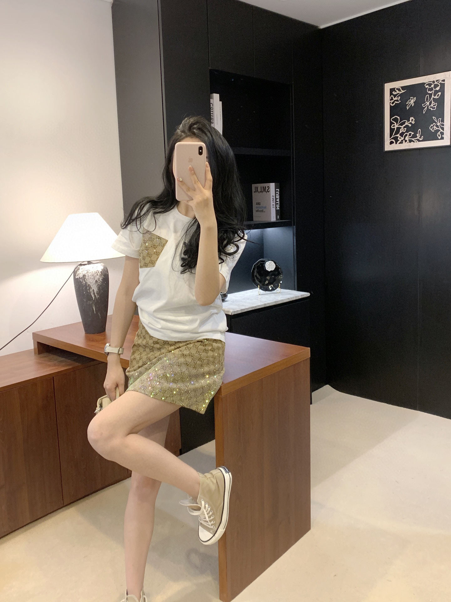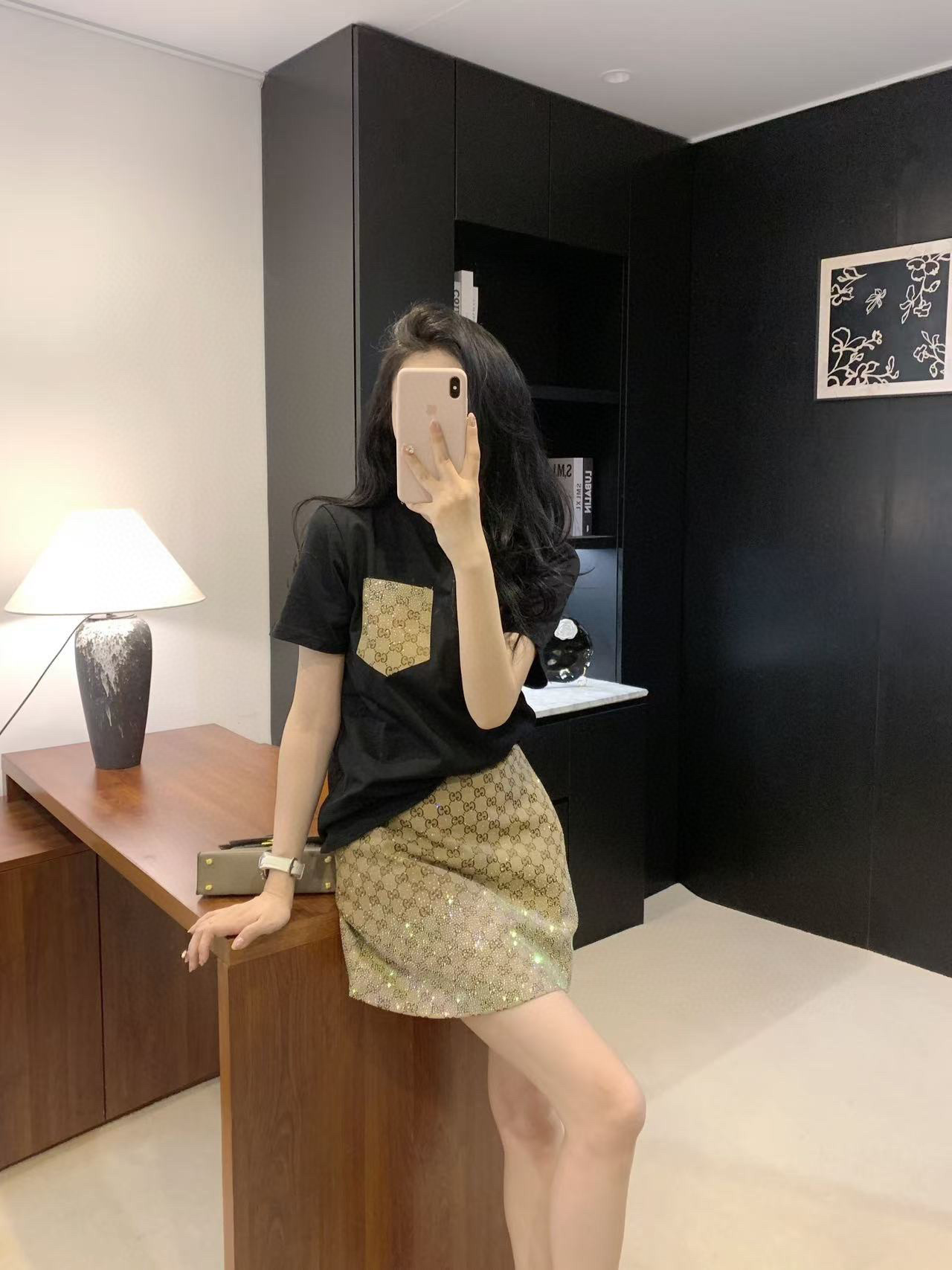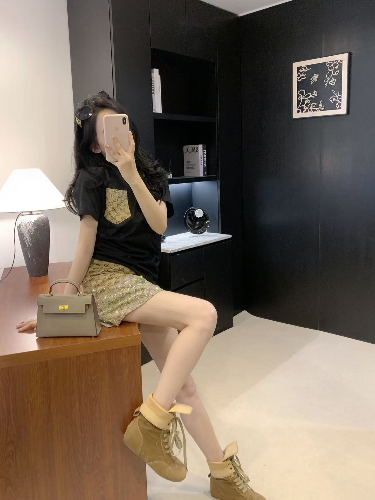 고품질 풀 프린트 핫 다이아몬드 GU 홈 레터 반팔 트렌디 브랜드 대외 무역 유럽 제품 라운드 넥 남성 및 여성 루즈 티셔츠 +